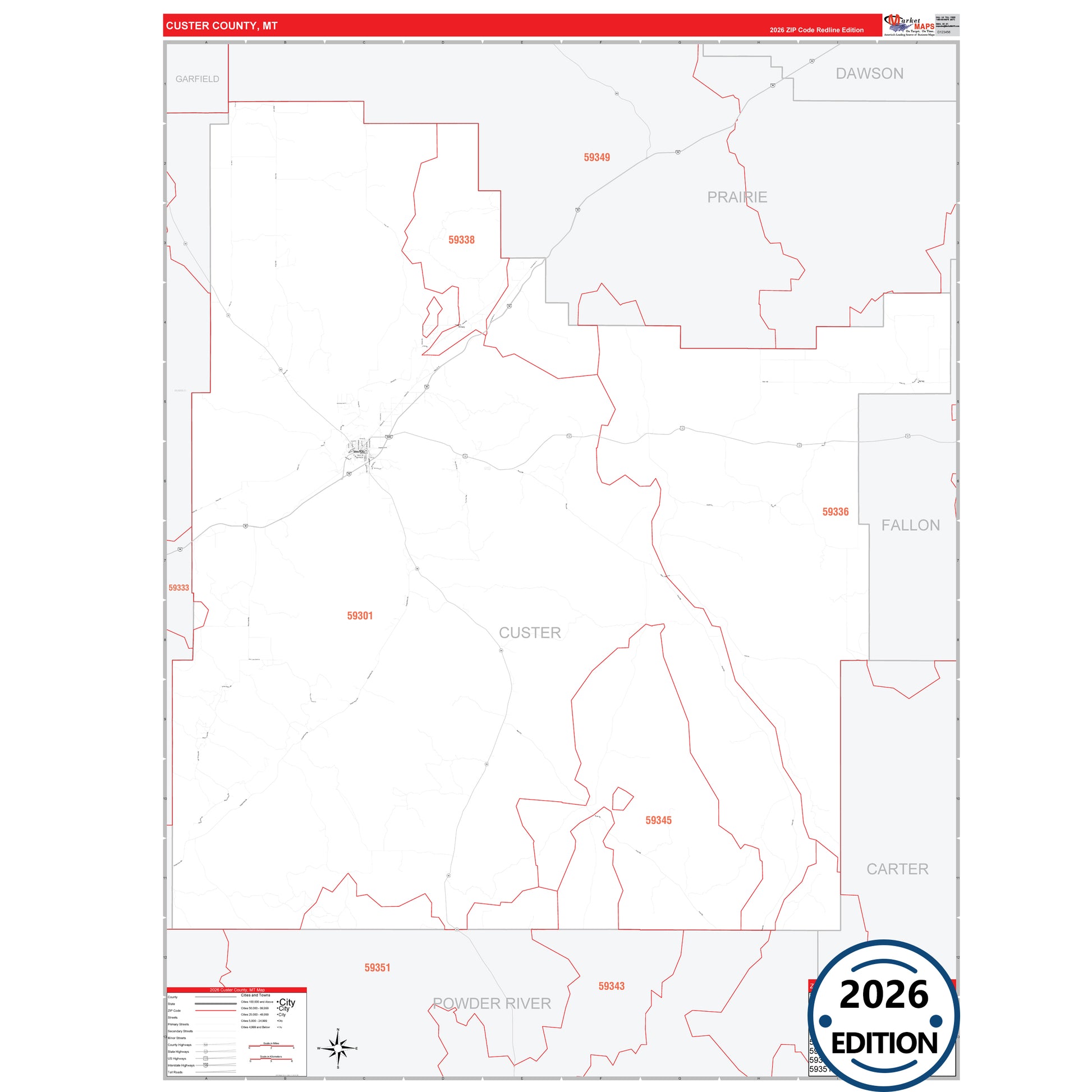 The RedLine Style map of Custer County, MT shows ZIP code areas overlaid on a detailed road network of Custer County, Montana. Ideal for drawing locations, territories, and other applications. Base map features include all major streets and highways labeled, cities and towns, county and state boundaries, neighborhood names, railroads, and a clean white background suitable for marking and planning.
