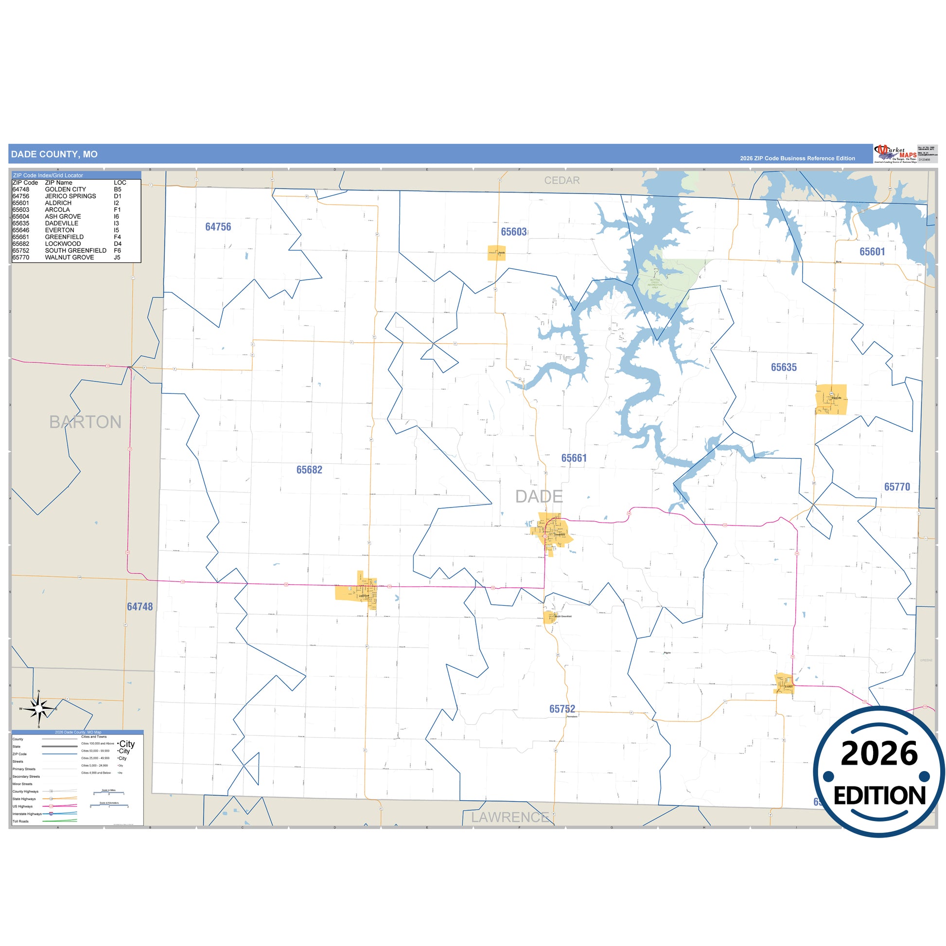 The Business Reference Style Dade County, MO is a detailed map that includes all towns, cities, major roadways, and highways. Available in multiple wall map sizes, perfect for home, school, office, or business display.
