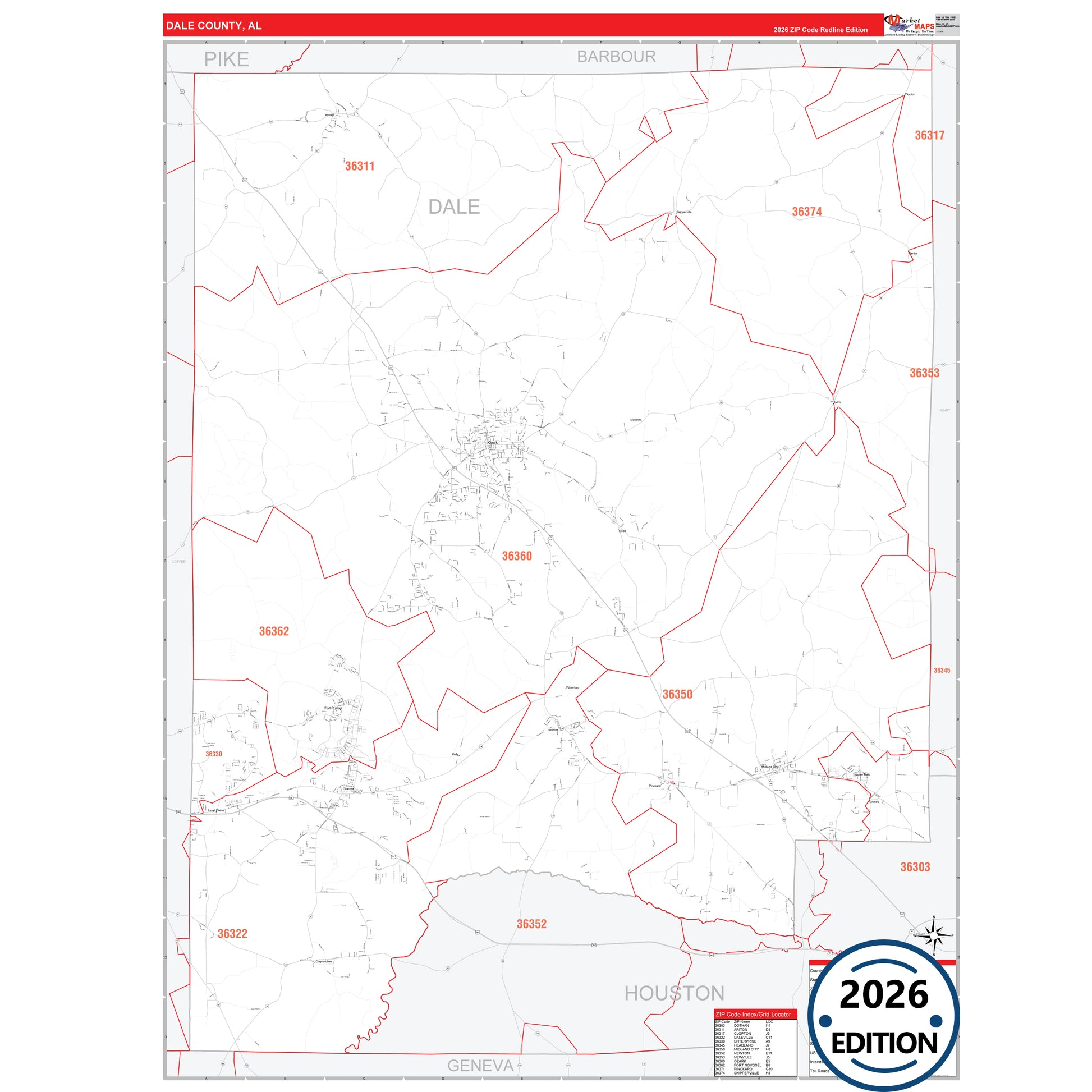 The RedLine Style map of Dale County, AL shows ZIP code areas overlaid on a detailed road network of Dale County, Alabama. Ideal for drawing locations, territories, and other applications. Base map features include all major streets and highways labeled, cities and towns, county and state boundaries, neighborhood names, railroads, and a clean white background suitable for marking and planning.