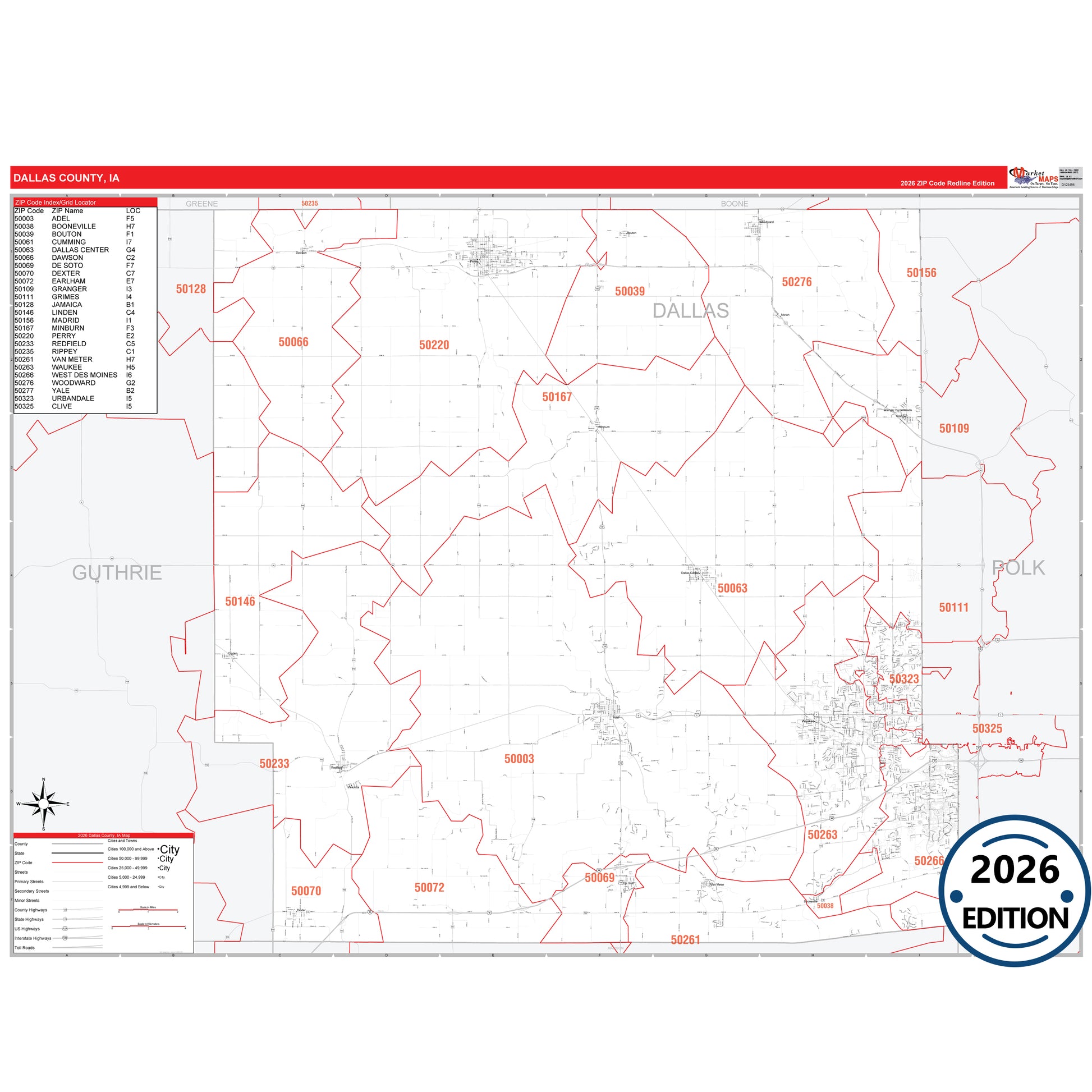 The RedLine Style map of Dallas County, IA shows ZIP code areas overlaid on a detailed road network of Dallas County, Iowa. Ideal for drawing locations, territories, and other applications. Base map features include all major streets and highways labeled, cities and towns, county and state boundaries, neighborhood names, railroads, and a clean white background suitable for marking and planning.