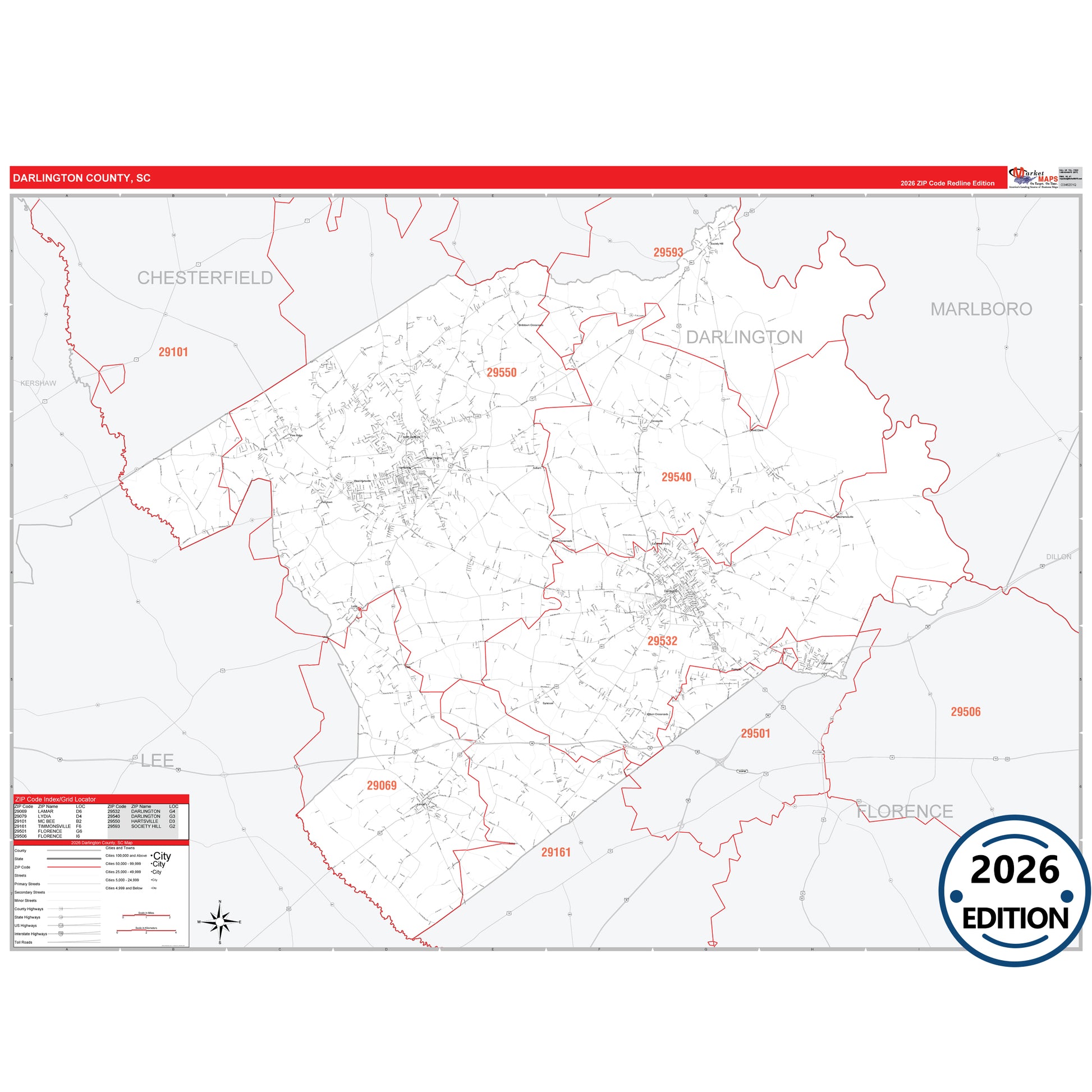 The RedLine Style map of Darlington County, SC shows ZIP code areas overlaid on a detailed road network of Darlington County, South Carolina. Ideal for drawing locations, territories, and other applications. Base map features include all major streets and highways labeled, cities and towns, county and state boundaries, neighborhood names, railroads, and a clean white background suitable for marking and planning.