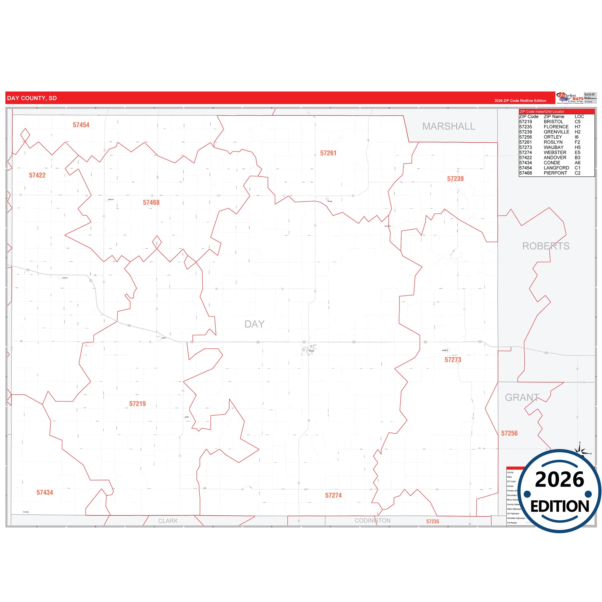 The RedLine Style map of Day County, SD shows ZIP code areas overlaid on a detailed road network of Day County, South Dakota. Ideal for drawing locations, territories, and other applications. Base map features include all major streets and highways labeled, cities and towns, county and state boundaries, neighborhood names, railroads, and a clean white background suitable for marking and planning.