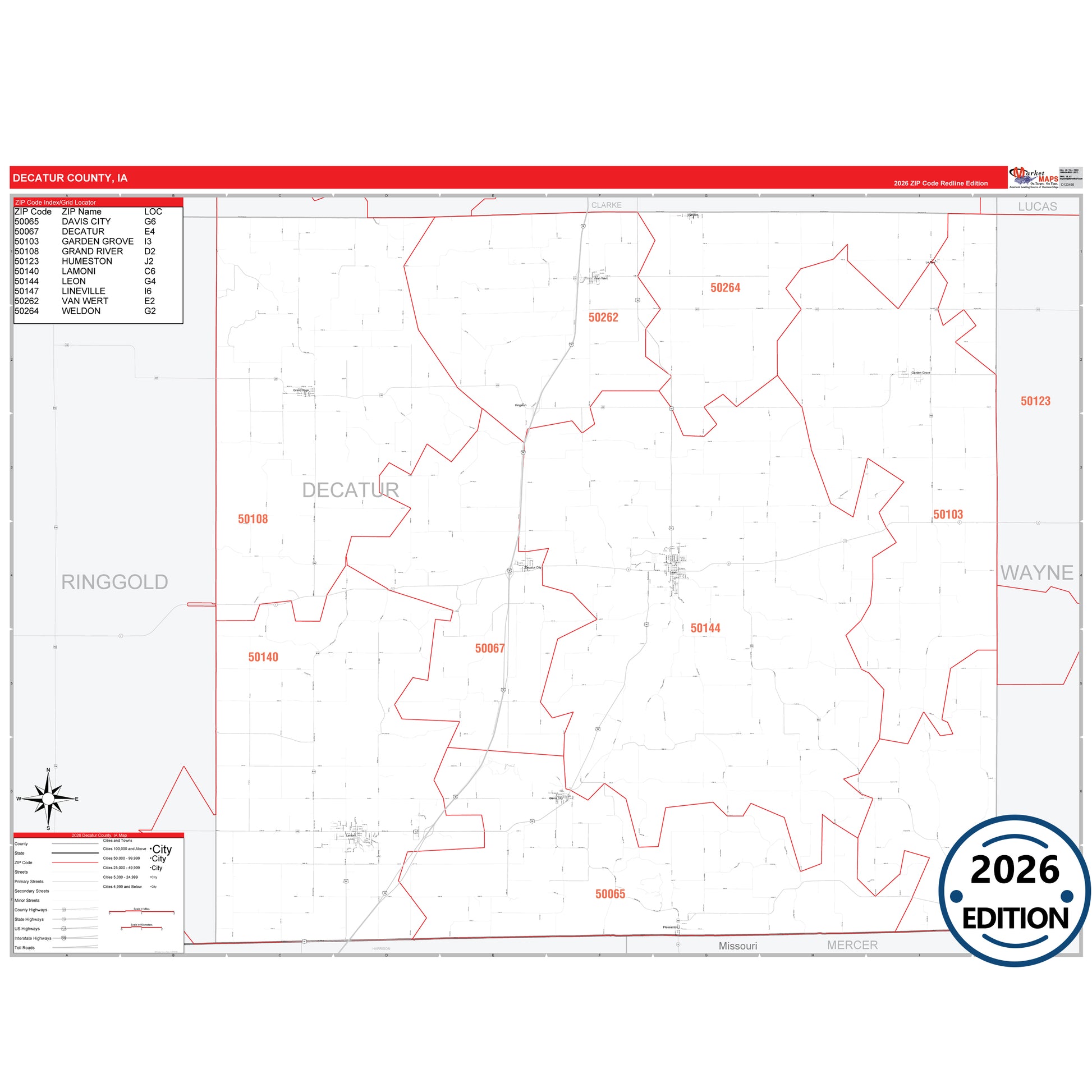 The RedLine Style map of Decatur County, IA shows ZIP code areas overlaid on a detailed road network of Decatur County, Iowa. Ideal for drawing locations, territories, and other applications. Base map features include all major streets and highways labeled, cities and towns, county and state boundaries, neighborhood names, railroads, and a clean white background suitable for marking and planning.