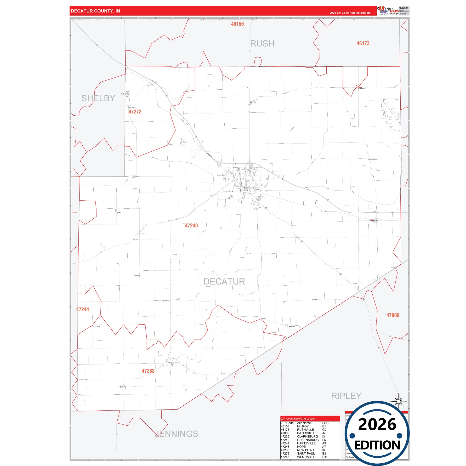 The RedLine Style map of Decatur County, IN shows ZIP code areas overlaid on a detailed road network of Decatur County, Indiana. Ideal for drawing locations, territories, and other applications. Base map features include all major streets and highways labeled, cities and towns, county and state boundaries, neighborhood names, railroads, and a clean white background suitable for marking and planning.