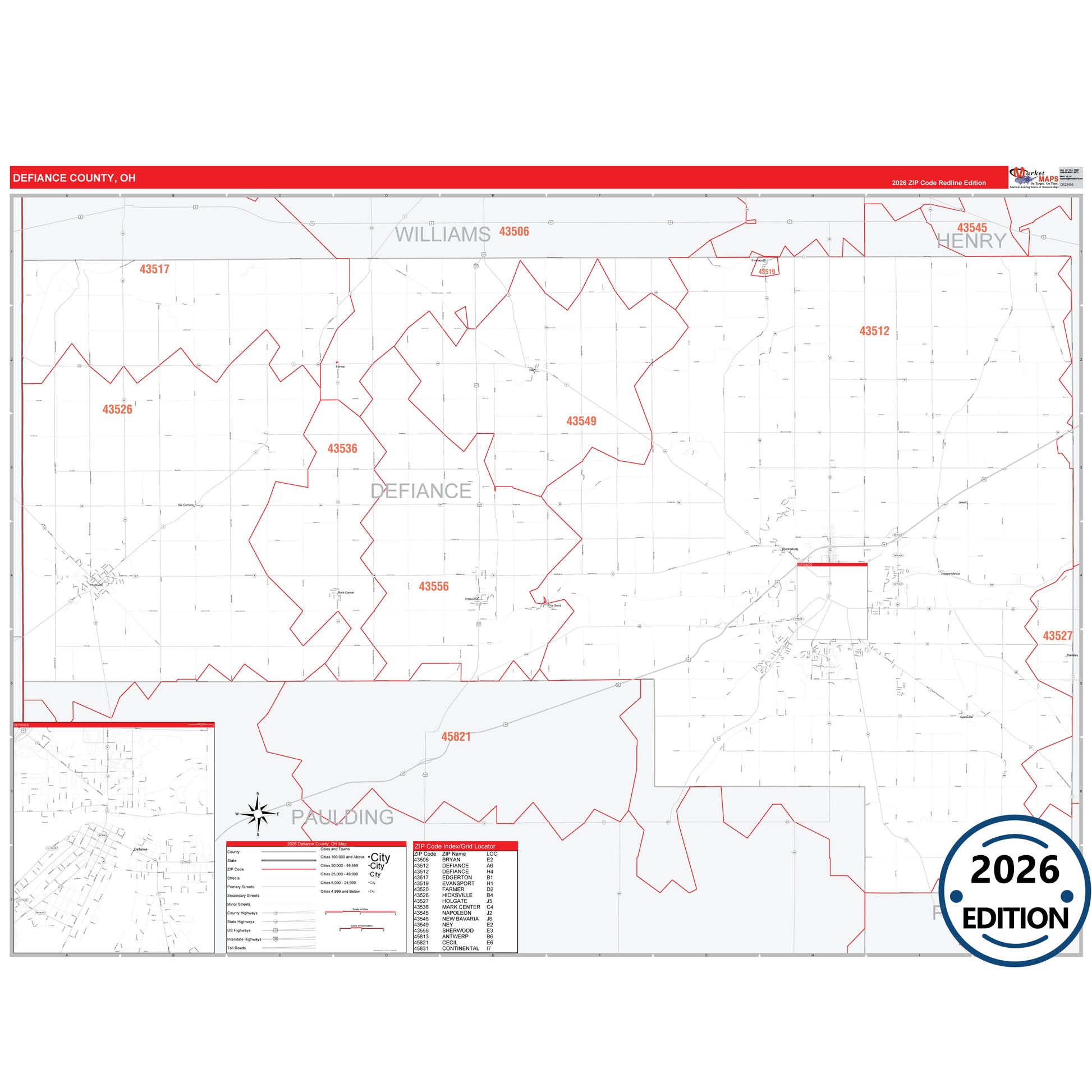 The RedLine Style map of Defiance County, OH shows ZIP code areas overlaid on a detailed road network of Defiance County, Ohio. Ideal for drawing locations, territories, and other applications. Base map features include all major streets and highways labeled, cities and towns, county and state boundaries, neighborhood names, railroads, and a clean white background suitable for marking and planning.