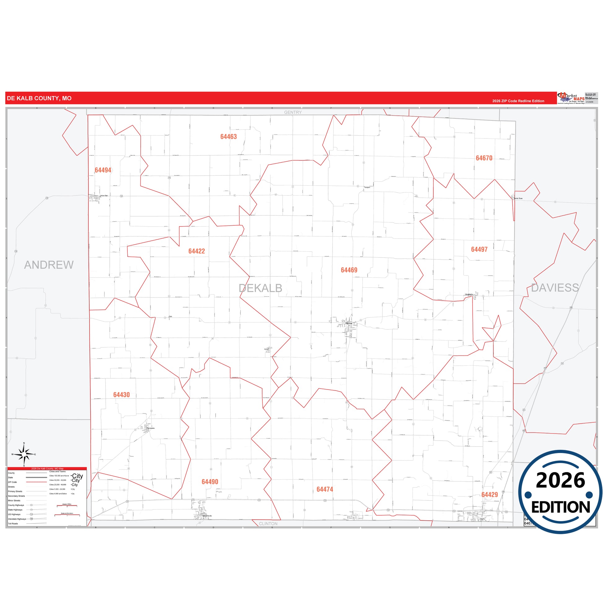 The RedLine Style map of DeKalb County, MO shows ZIP code areas overlaid on a detailed road network of DeKalb County, Missouri. Ideal for drawing locations, territories, and other applications. Base map features include all major streets and highways labeled, cities and towns, county and state boundaries, neighborhood names, railroads, and a clean white background suitable for marking and planning.