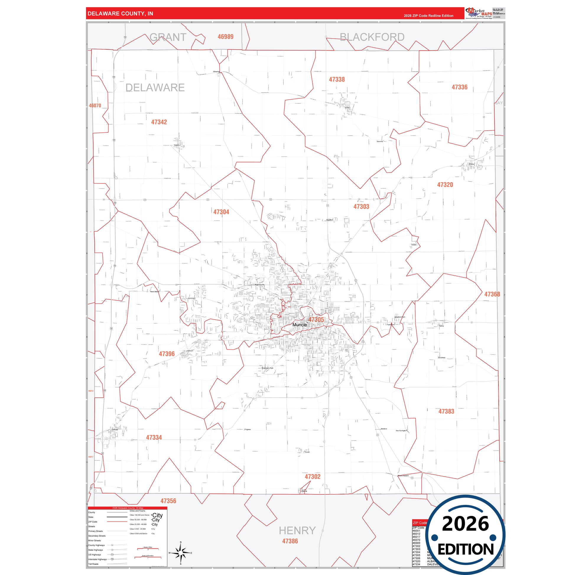 The RedLine Style map of Delaware County, IN shows ZIP code areas overlaid on a detailed road network of Delaware County, Indiana. Ideal for drawing locations, territories, and other applications. Base map features include all major streets and highways labeled, cities and towns, county and state boundaries, neighborhood names, railroads, and a clean white background suitable for marking and planning.