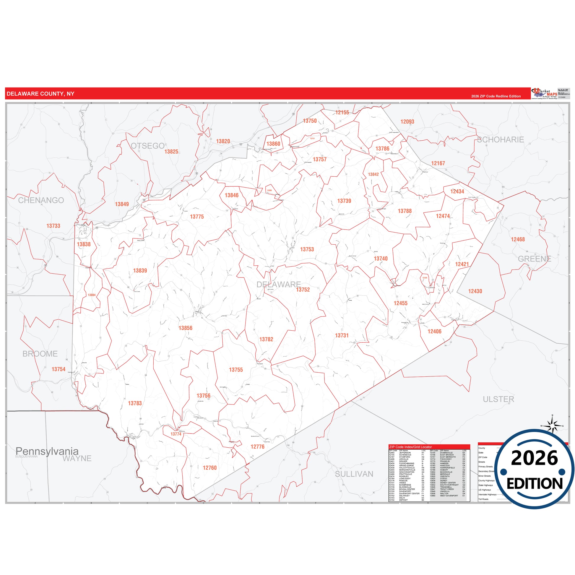 The RedLine Style map of Delaware County, NY shows ZIP code areas overlaid on a detailed road network of Delaware County, New York. Ideal for drawing locations, territories, and other applications. Base map features include all major streets and highways labeled, cities and towns, county and state boundaries, neighborhood names, railroads, and a clean white background suitable for marking and planning.