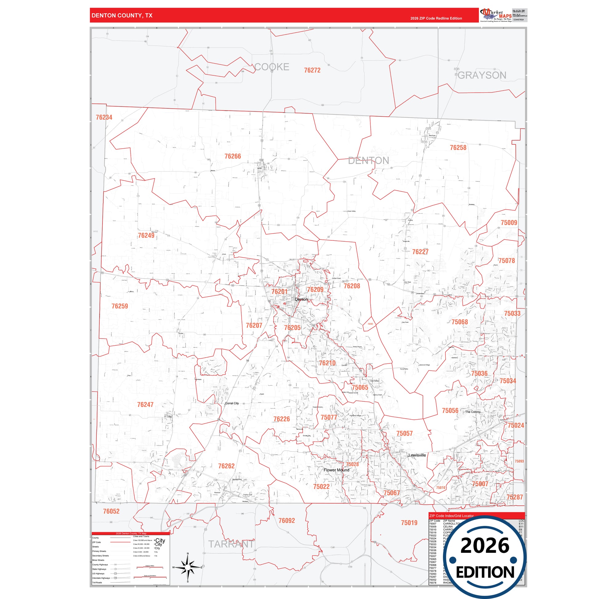 The RedLine Style map of Denton County, TX shows ZIP code areas overlaid on a detailed road network of Denton County, Texas. Ideal for drawing locations, territories, and other applications. Base map features include all major streets and highways labeled, cities and towns, county and state boundaries, neighborhood names, railroads, and a clean white background suitable for marking and planning.