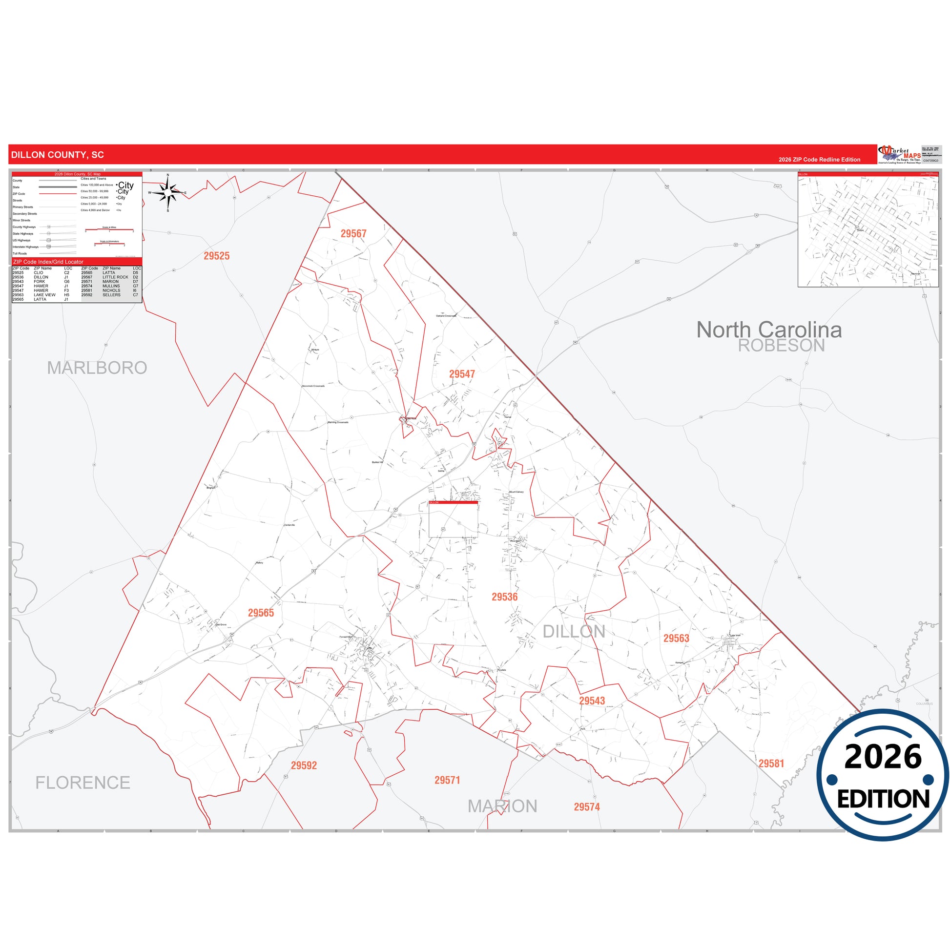 The RedLine Style map of Dillon County, SC shows ZIP code areas overlaid on a detailed road network of Dillon County, South Carolina. Ideal for drawing locations, territories, and other applications. Base map features include all major streets and highways labeled, cities and towns, county and state boundaries, neighborhood names, railroads, and a clean white background suitable for marking and planning.