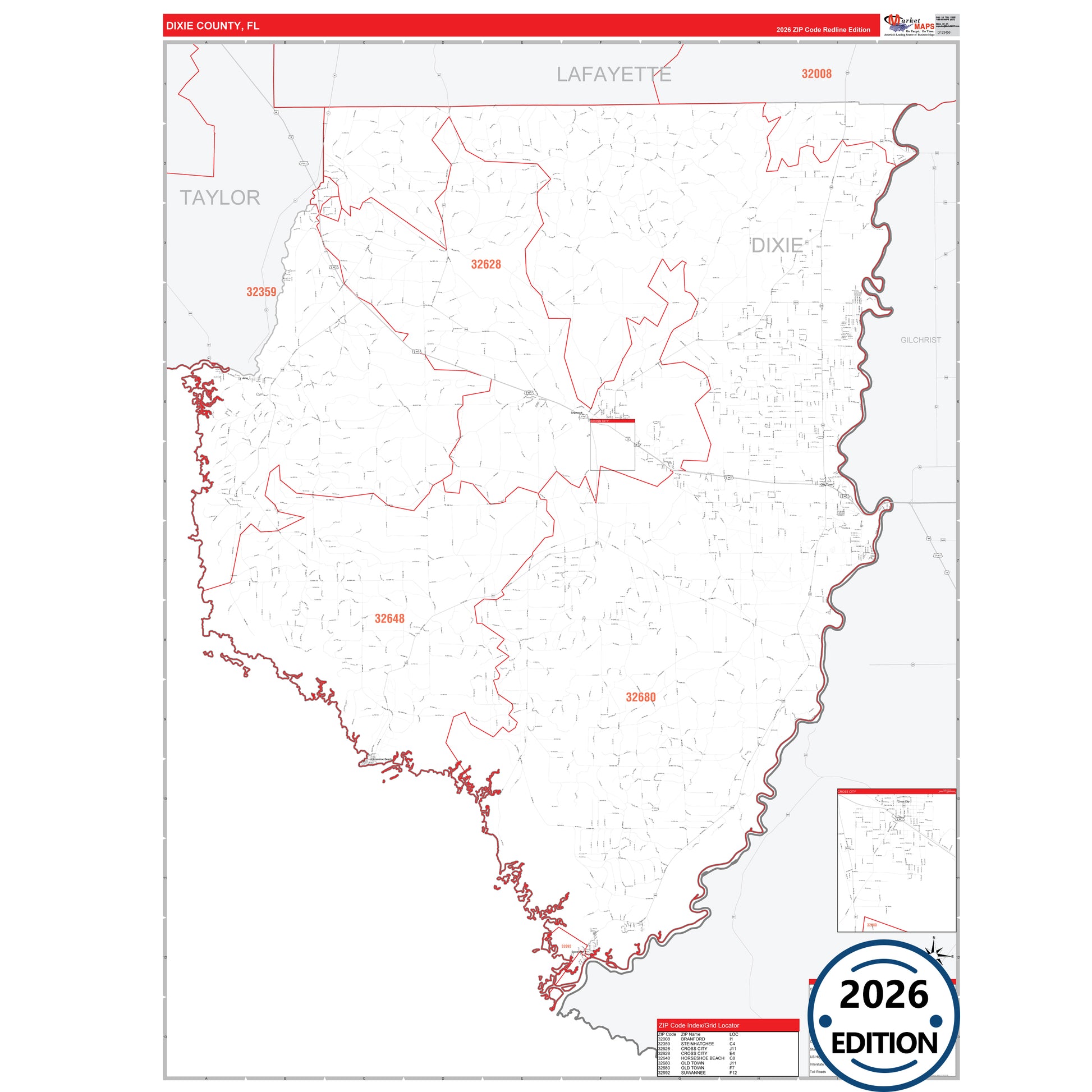 The RedLine Style map of Dixie County, FL shows ZIP code areas overlaid on a detailed road network of Dixie County, Florida. Ideal for drawing locations, territories, and other applications. Base map features include all major streets and highways labeled, cities and towns, county and state boundaries, neighborhood names, railroads, and a clean white background suitable for marking and planning.
