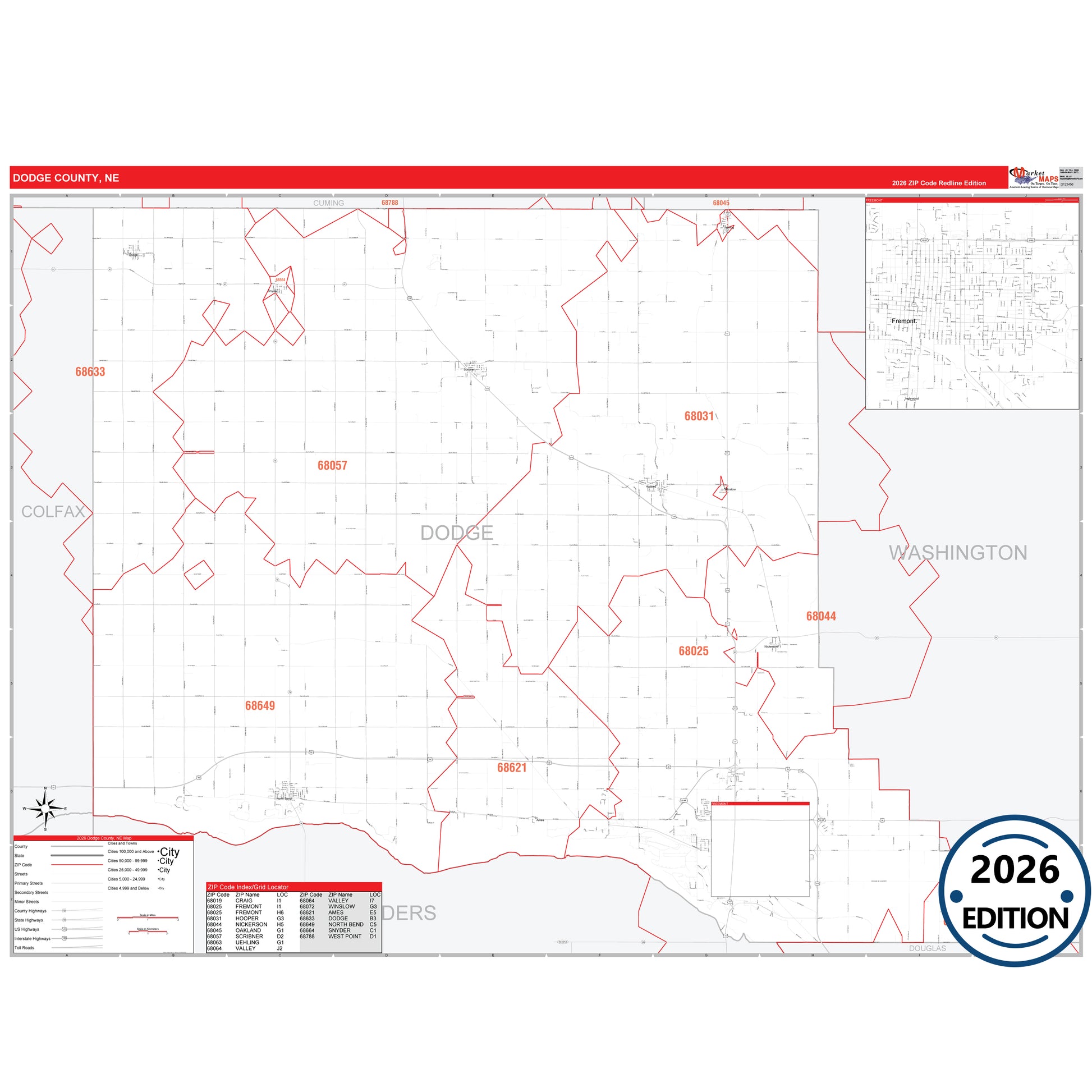 The RedLine Style map of Dodge County, NE shows ZIP code areas overlaid on a detailed road network of Dodge County, Nebraska. Ideal for drawing locations, territories, and other applications. Base map features include all major streets and highways labeled, cities and towns, county and state boundaries, neighborhood names, railroads, and a clean white background suitable for marking and planning.