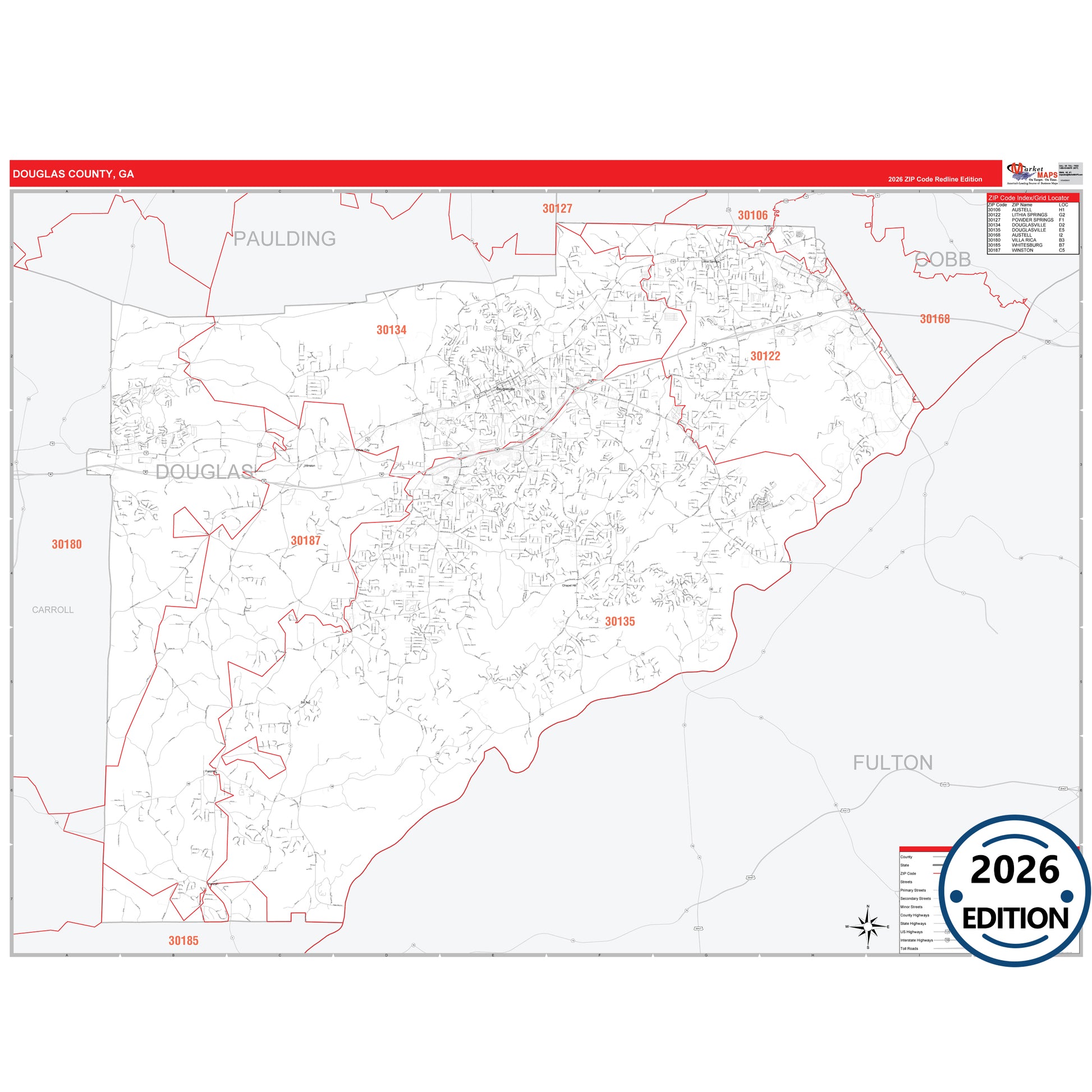 The RedLine Style map of Douglas County, GA shows ZIP code areas overlaid on a detailed road network of Douglas County, Georgia. Ideal for drawing locations, territories, and other applications. Base map features include all major streets and highways labeled, cities and towns, county and state boundaries, neighborhood names, railroads, and a clean white background suitable for marking and planning.