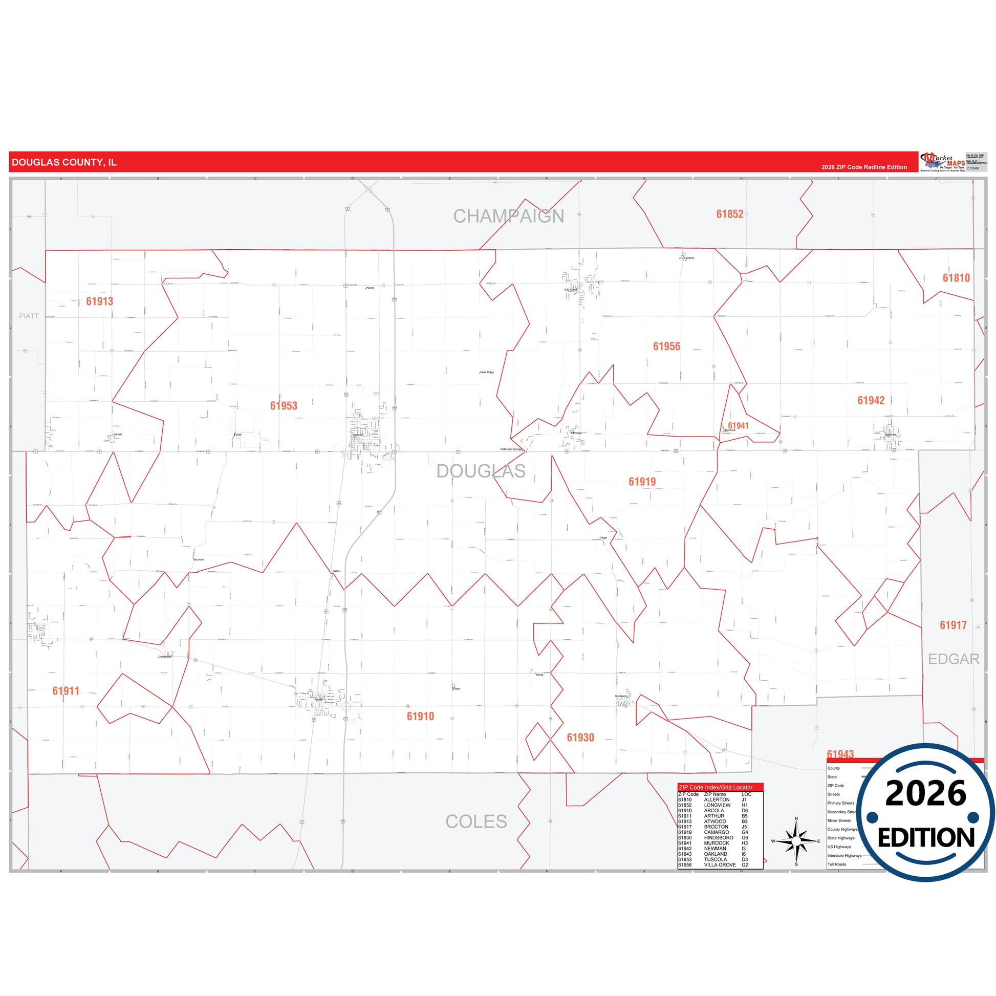 The RedLine Style map of Douglas County, IL shows ZIP code areas overlaid on a detailed road network of Douglas County, Illinois. Ideal for drawing locations, territories, and other applications. Base map features include all major streets and highways labeled, cities and towns, county and state boundaries, neighborhood names, railroads, and a clean white background suitable for marking and planning.