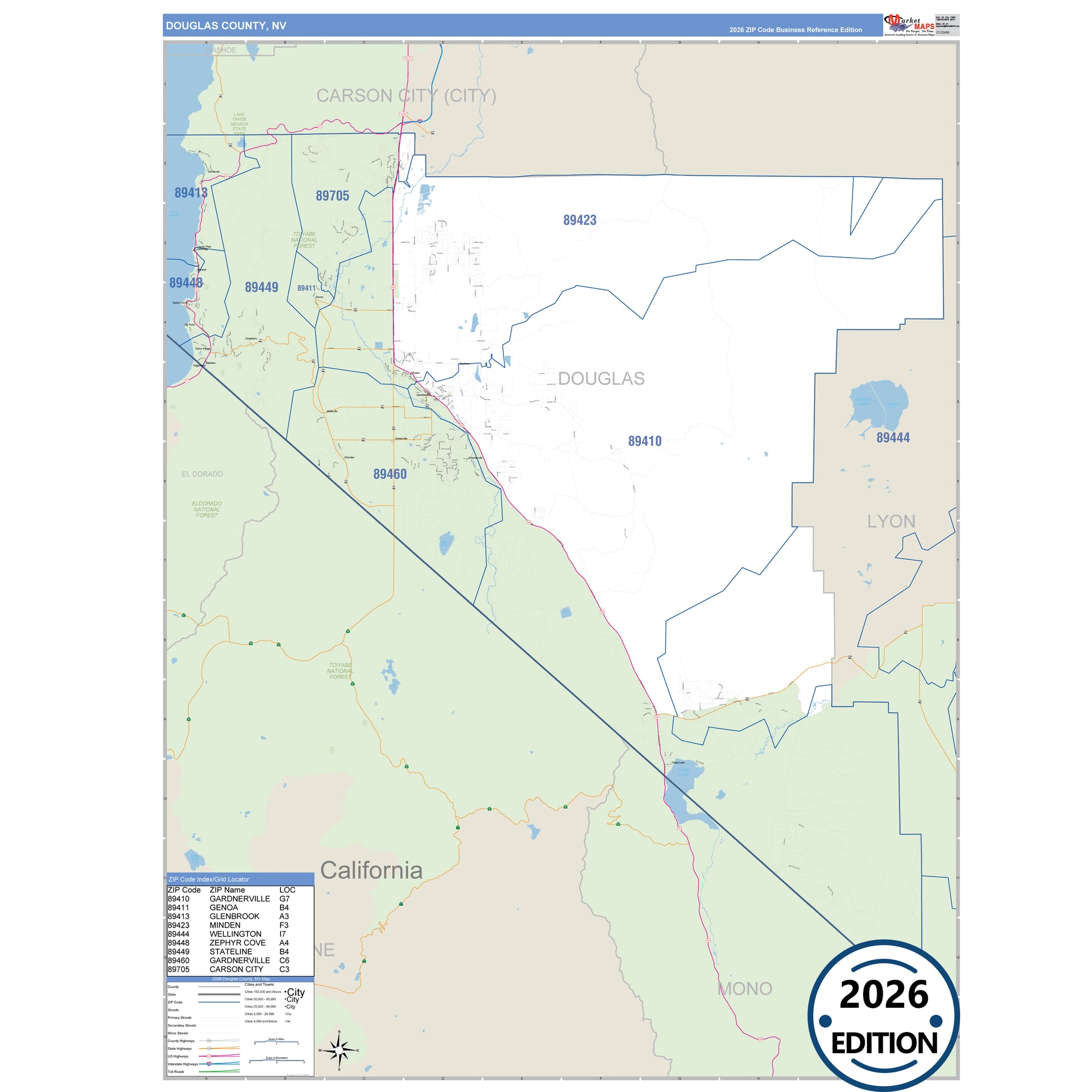 The Business Reference Style Douglas County, NV is a detailed map that includes all towns, cities, major roadways, and highways. Available in multiple wall map sizes, perfect for home, school, office, or business display.