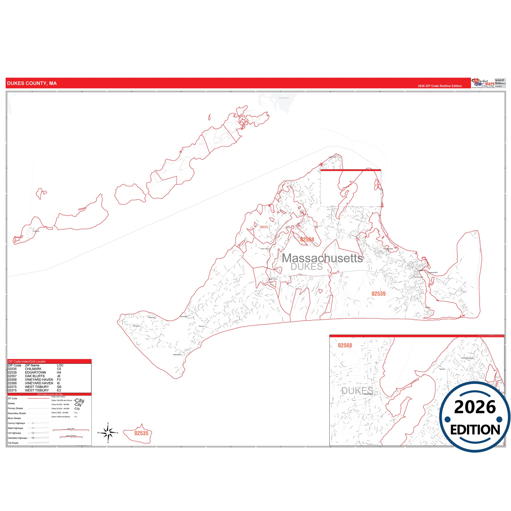 The RedLine Style map of Dukes County, MA shows ZIP code areas overlaid on a detailed road network of Dukes County, Massachusetts. Ideal for drawing locations, territories, and other applications. Base map features include all major streets and highways labeled, cities and towns, county and state boundaries, neighborhood names, railroads, and a clean white background suitable for marking and planning.