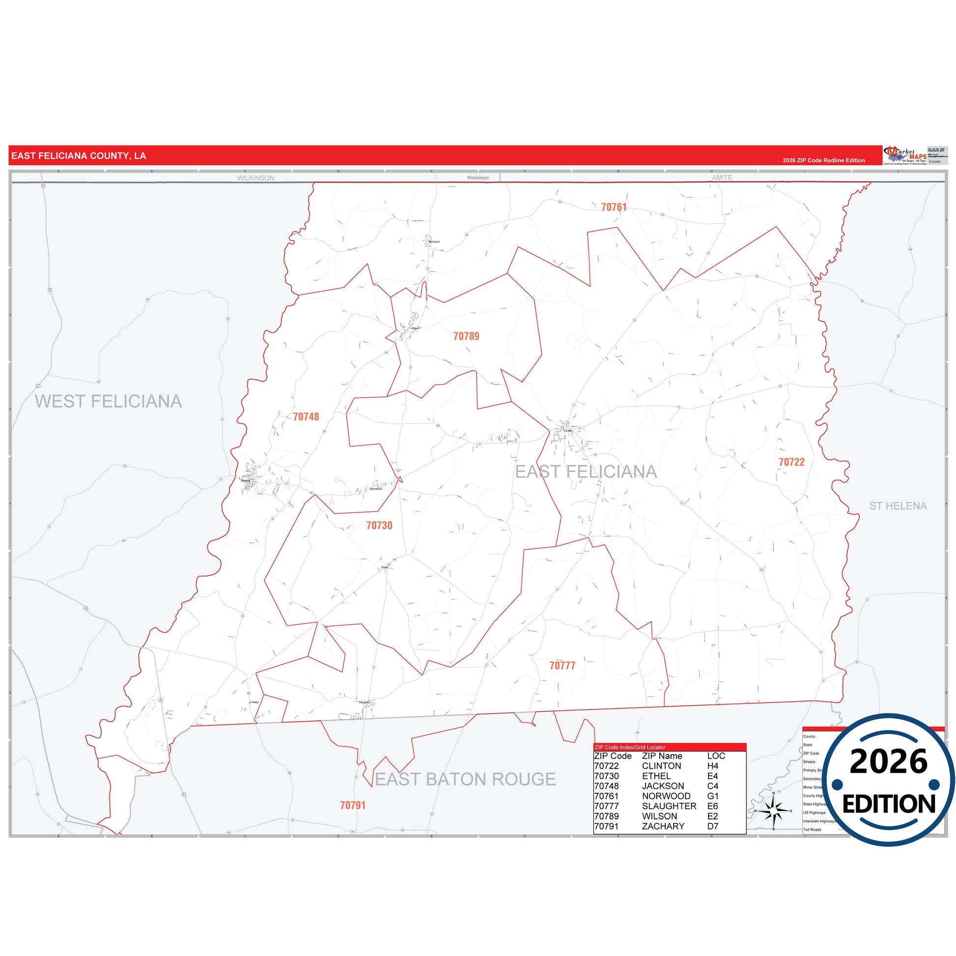 The RedLine Style map of East Feliciana County, LA shows ZIP code areas overlaid on a detailed road network of East Feliciana County, Louisiana. Ideal for drawing locations, territories, and other applications. Base map features include all major streets and highways labeled, cities and towns, county and state boundaries, neighborhood names, railroads, and a clean white background suitable for marking and planning.