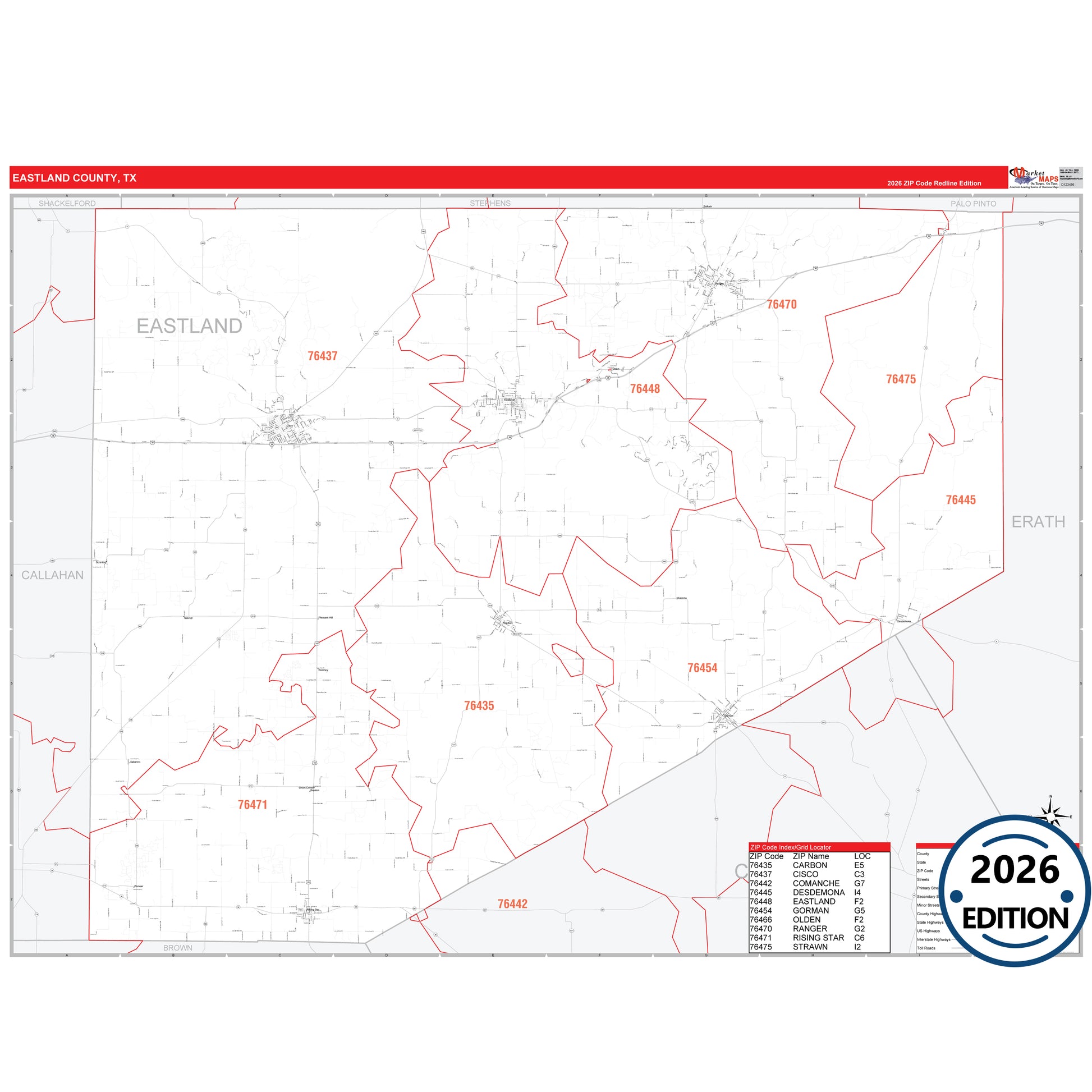 The RedLine Style map of Eastland County, TX shows ZIP code areas overlaid on a detailed road network of Eastland County, Texas. Ideal for drawing locations, territories, and other applications. Base map features include all major streets and highways labeled, cities and towns, county and state boundaries, neighborhood names, railroads, and a clean white background suitable for marking and planning.
