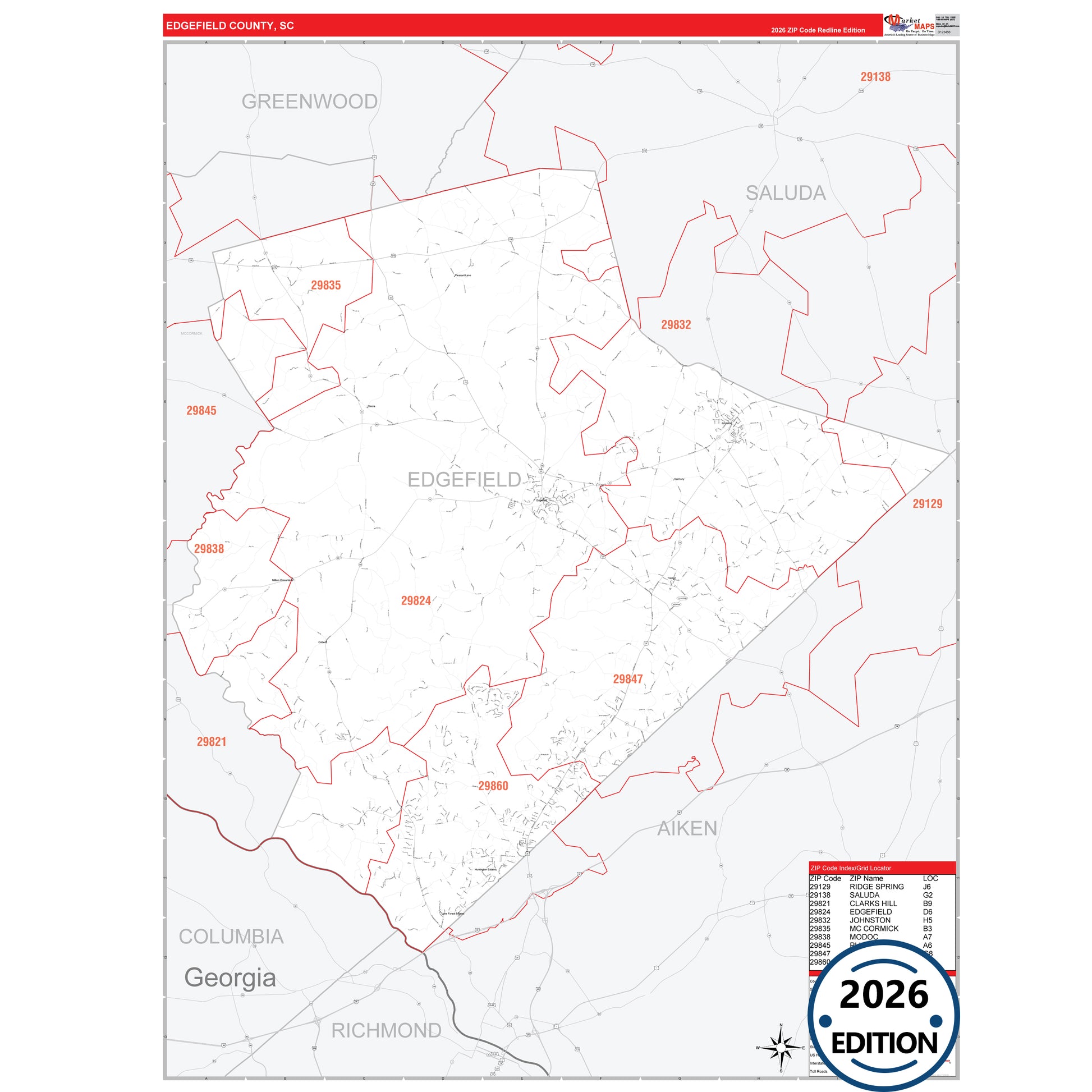 The RedLine Style map of Edgefield County, SC shows ZIP code areas overlaid on a detailed road network of Edgefield County, South Carolina. Ideal for drawing locations, territories, and other applications. Base map features include all major streets and highways labeled, cities and towns, county and state boundaries, neighborhood names, railroads, and a clean white background suitable for marking and planning.