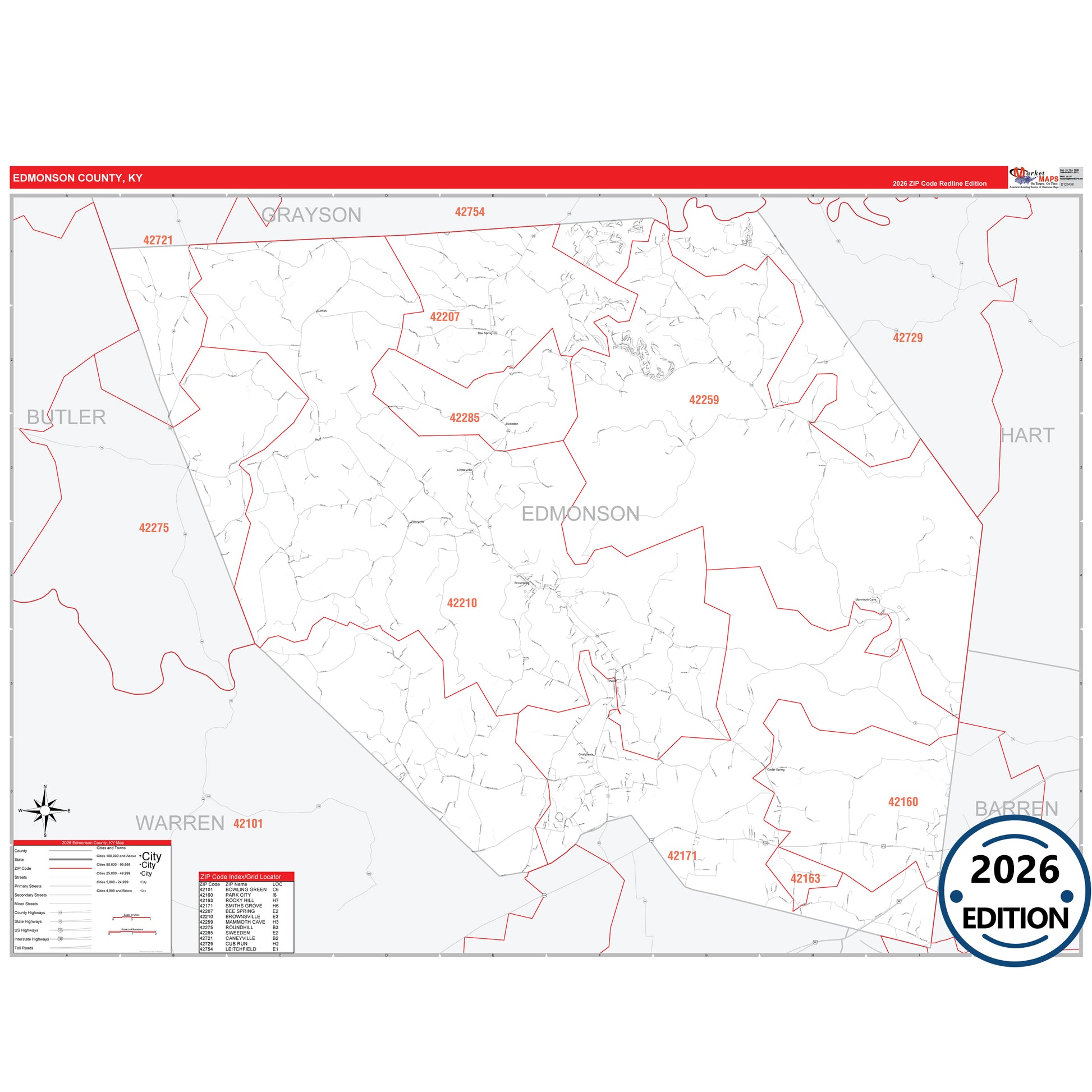 The RedLine Style map of Edmonson County, KY shows ZIP code areas overlaid on a detailed road network of Edmonson County, Kentucky. Ideal for drawing locations, territories, and other applications. Base map features include all major streets and highways labeled, cities and towns, county and state boundaries, neighborhood names, railroads, and a clean white background suitable for marking and planning.