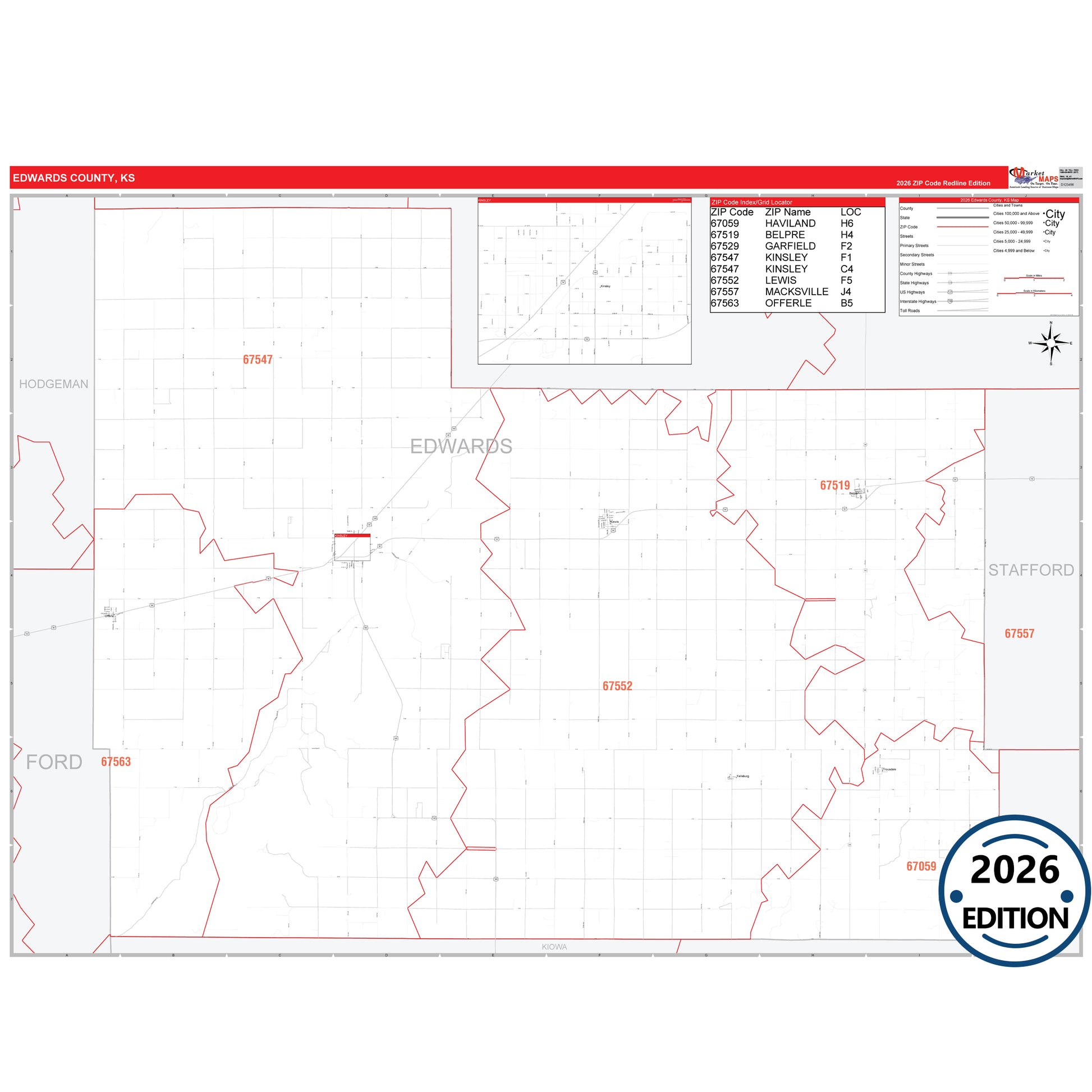 The RedLine Style map of Edwards County, KS shows ZIP code areas overlaid on a detailed road network of Edwards County, Kansas. Ideal for drawing locations, territories, and other applications. Base map features include all major streets and highways labeled, cities and towns, county and state boundaries, neighborhood names, railroads, and a clean white background suitable for marking and planning.
