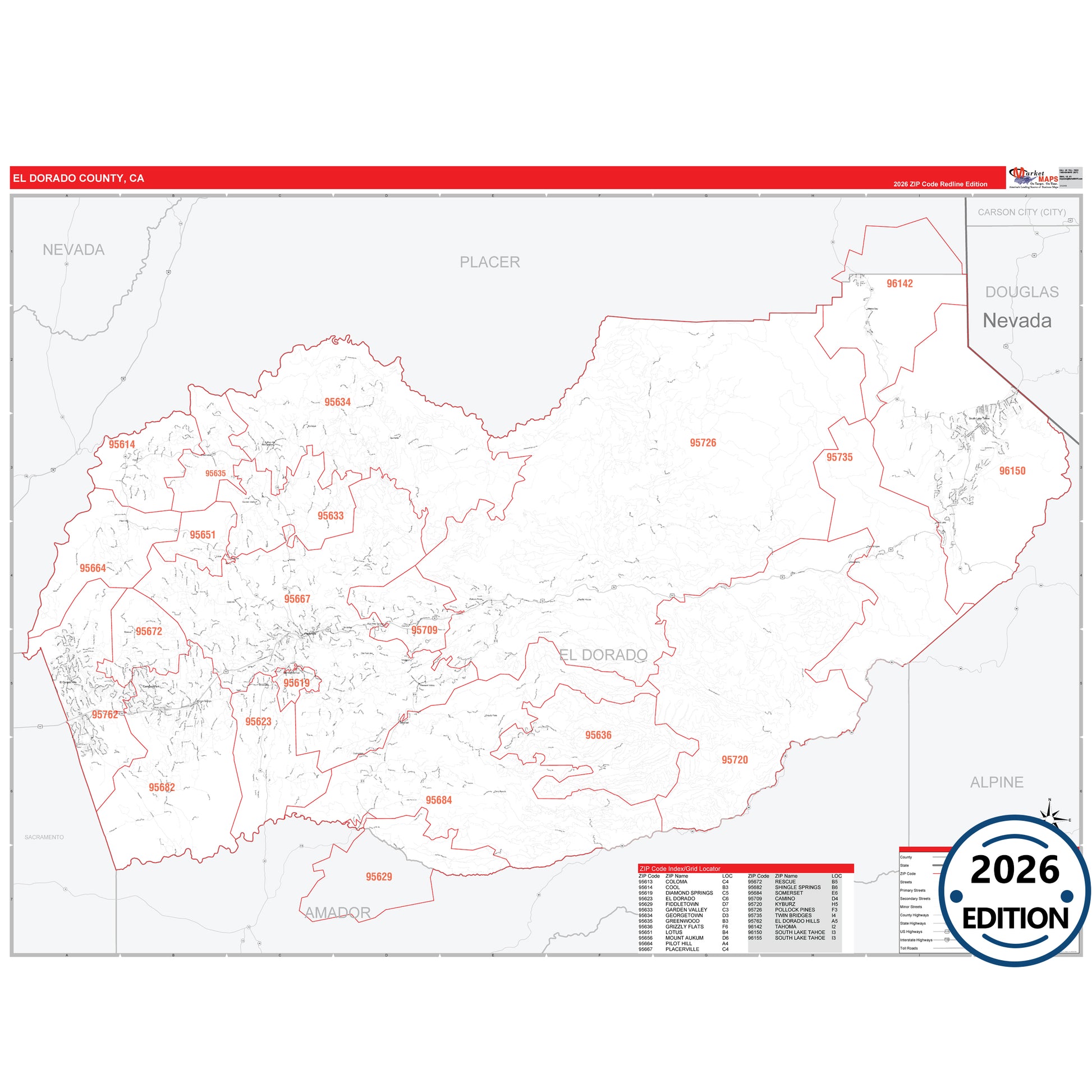 The RedLine Style map of El Dorado County, CA shows ZIP code areas overlaid on a detailed road network of El Dorado County, California. Ideal for drawing locations, territories, and other applications. Base map features include all major streets and highways labeled, cities and towns, county and state boundaries, neighborhood names, railroads, and a clean white background suitable for marking and planning.