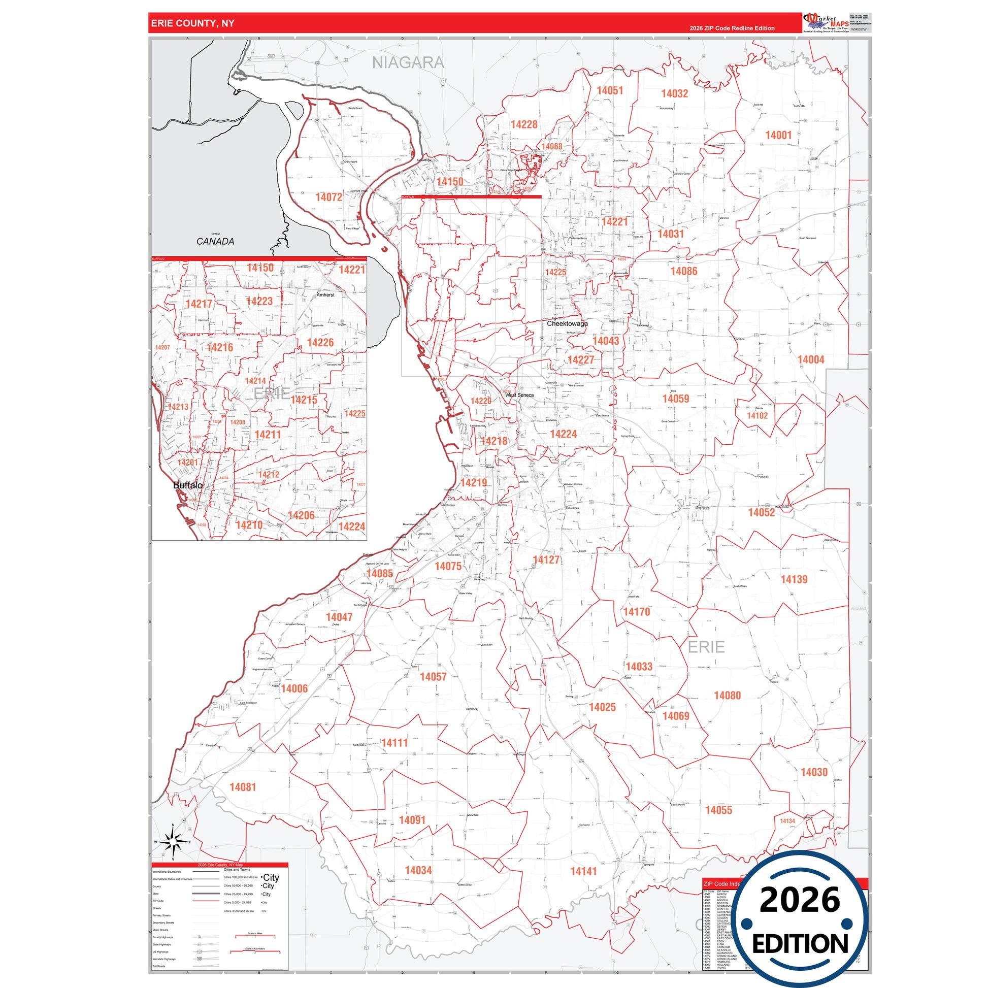 The RedLine Style map of Erie County, NY shows ZIP code areas overlaid on a detailed road network of Erie County, New York. Ideal for drawing locations, territories, and other applications. Base map features include all major streets and highways labeled, cities and towns, county and state boundaries, neighborhood names, railroads, and a clean white background suitable for marking and planning.