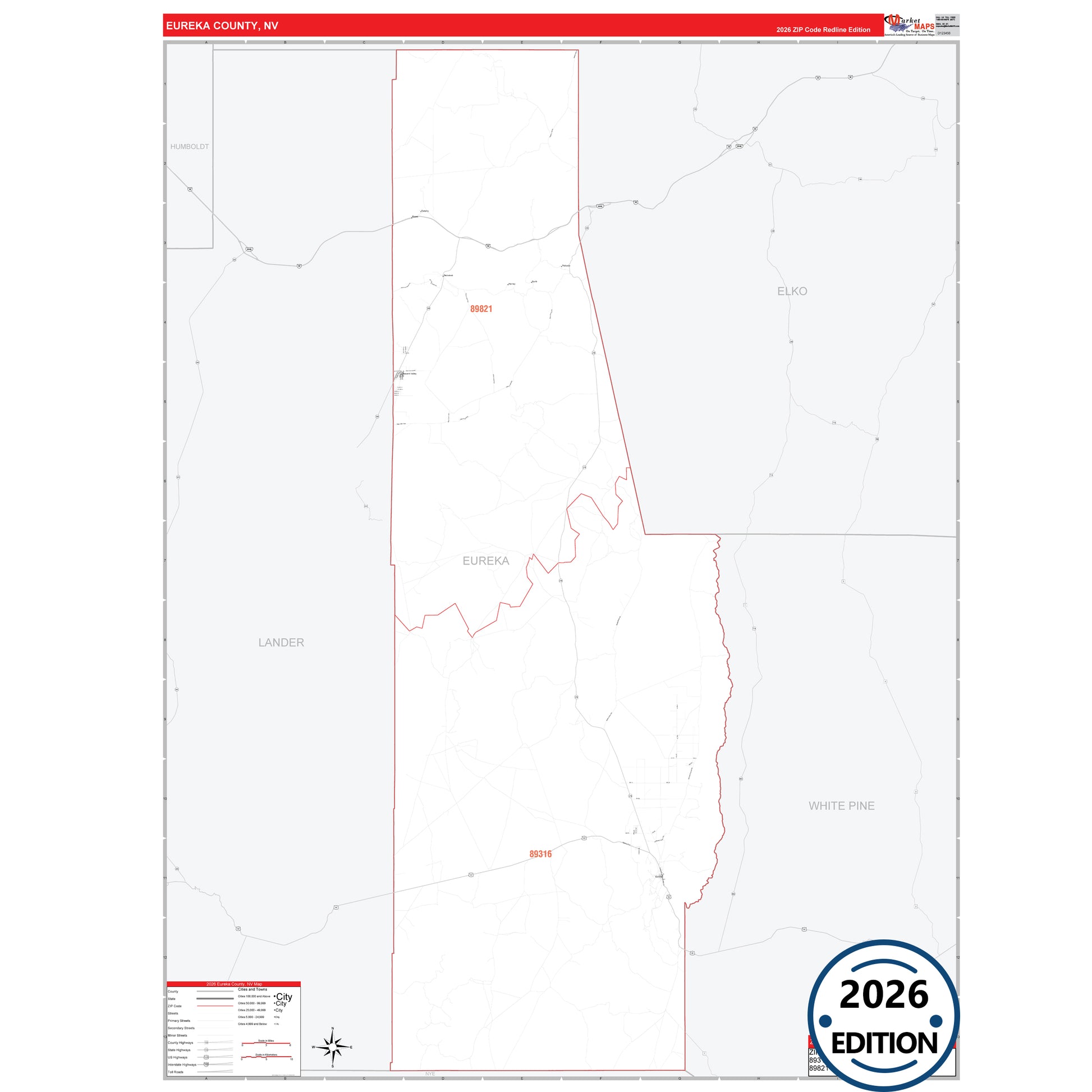 The RedLine Style map of Eureka County, NV shows ZIP code areas overlaid on a detailed road network of Eureka County, Nevada. Ideal for drawing locations, territories, and other applications. Base map features include all major streets and highways labeled, cities and towns, county and state boundaries, neighborhood names, railroads, and a clean white background suitable for marking and planning.