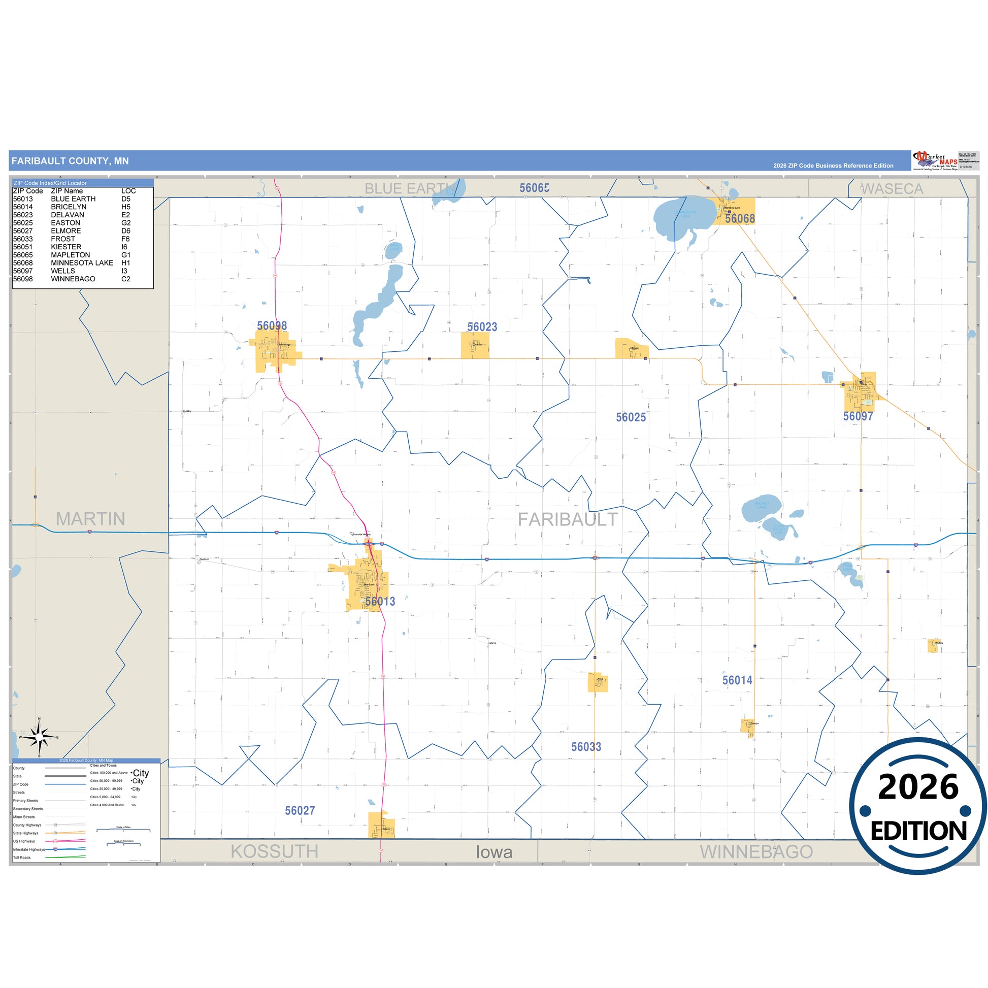The Business Reference Style Faribault County, MN is a detailed map that includes all towns, cities, major roadways, and highways. Available in multiple wall map sizes, perfect for home, school, office, or business display.