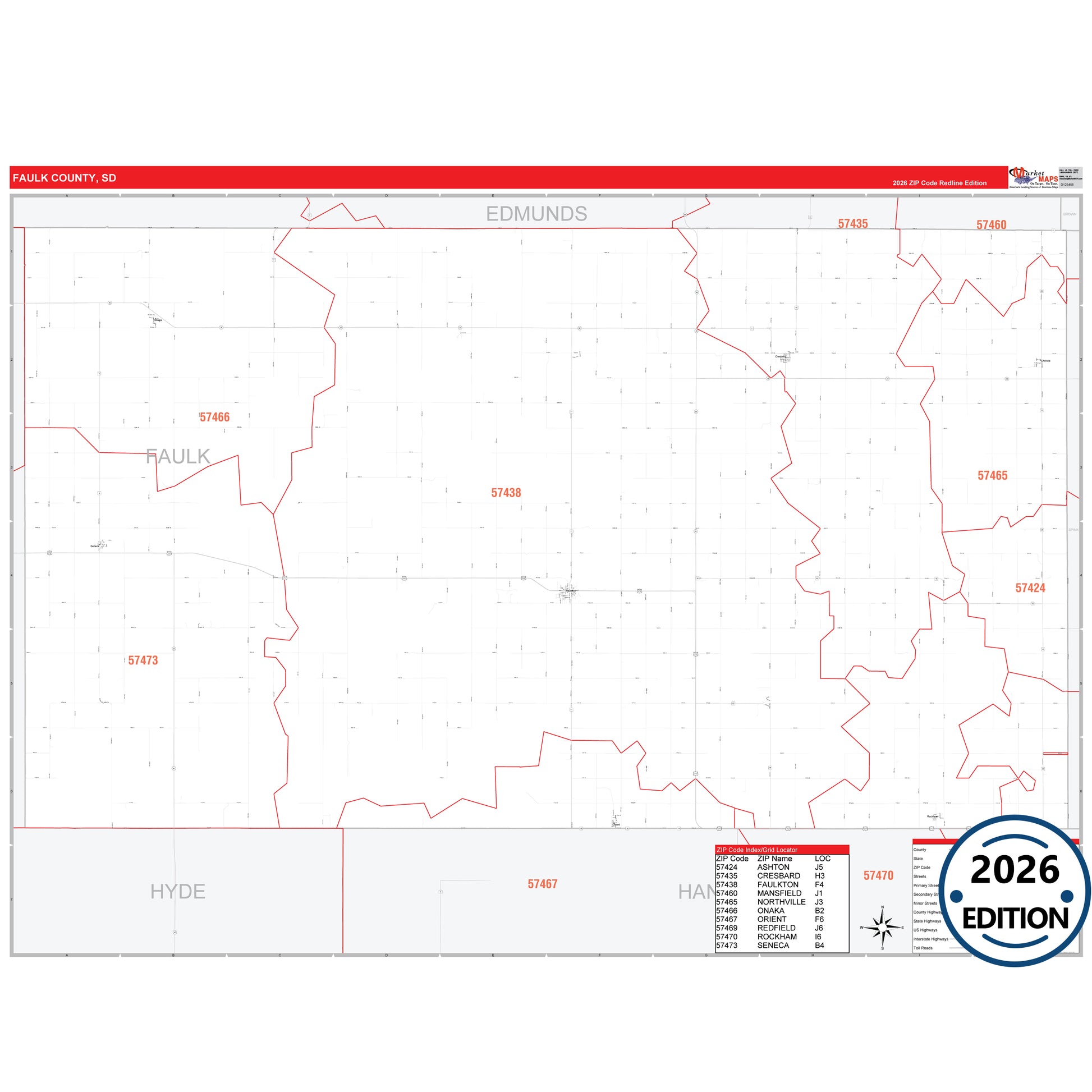 The RedLine Style map of Faulk County, SD shows ZIP code areas overlaid on a detailed road network of Faulk County, South Dakota. Ideal for drawing locations, territories, and other applications. Base map features include all major streets and highways labeled, cities and towns, county and state boundaries, neighborhood names, railroads, and a clean white background suitable for marking and planning.
