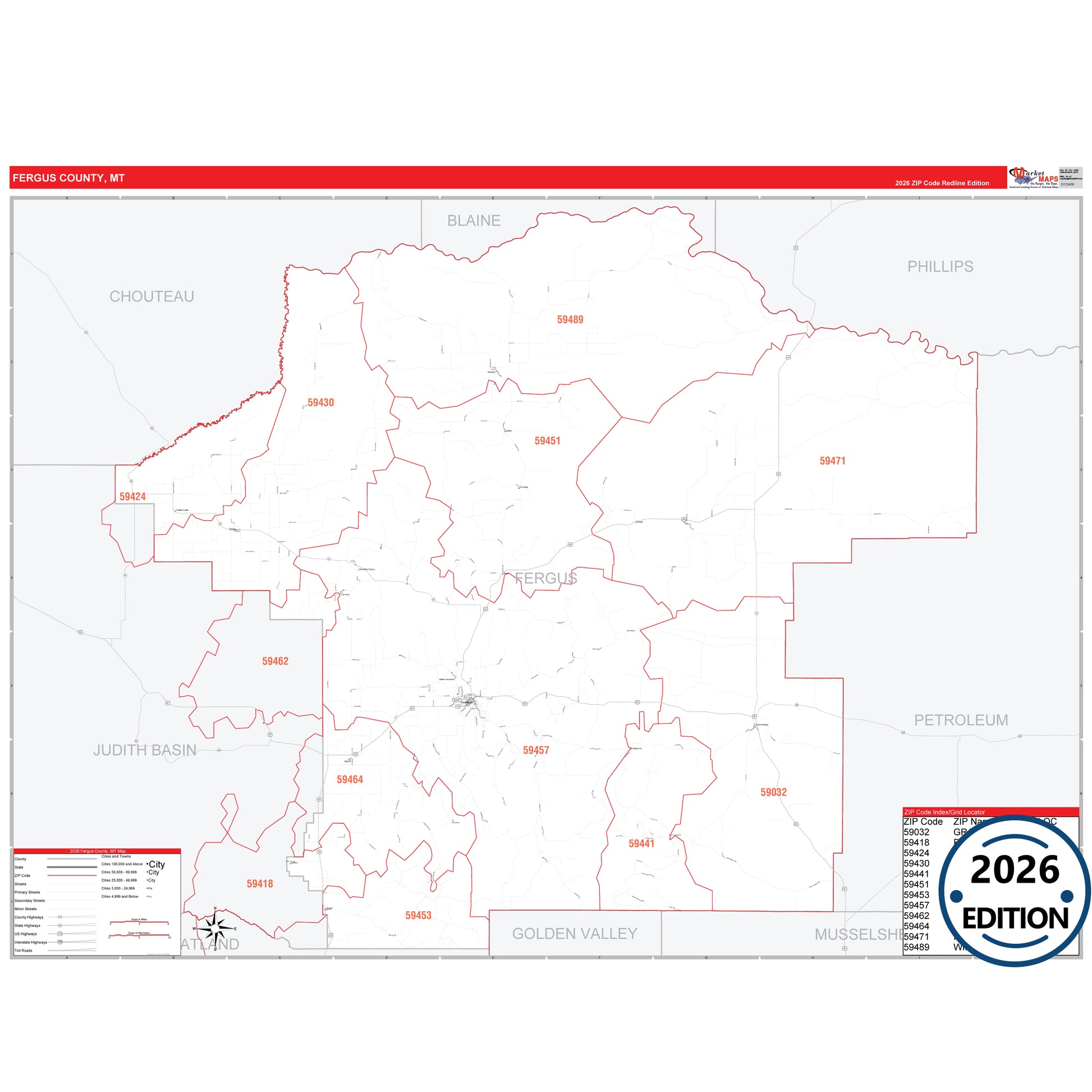 The RedLine Style map of Fergus County, MT shows ZIP code areas overlaid on a detailed road network of Fergus County, Montana. Ideal for drawing locations, territories, and other applications. Base map features include all major streets and highways labeled, cities and towns, county and state boundaries, neighborhood names, railroads, and a clean white background suitable for marking and planning.