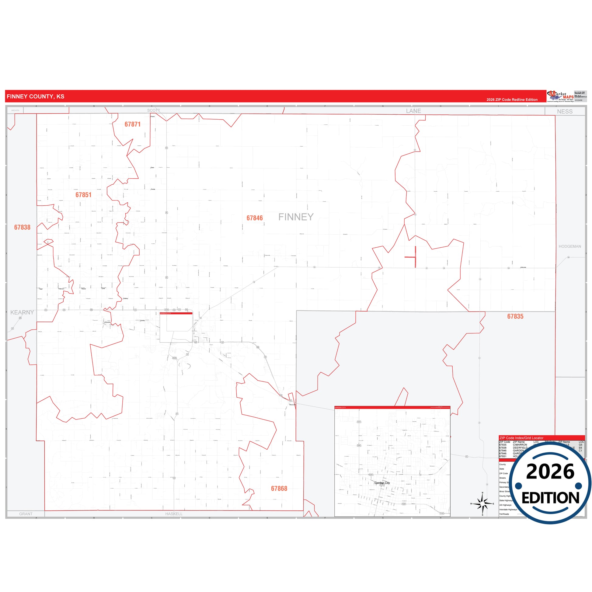 The RedLine Style map of Finney County, KS shows ZIP code areas overlaid on a detailed road network of Finney County, Kansas. Ideal for drawing locations, territories, and other applications. Base map features include all major streets and highways labeled, cities and towns, county and state boundaries, neighborhood names, railroads, and a clean white background suitable for marking and planning.