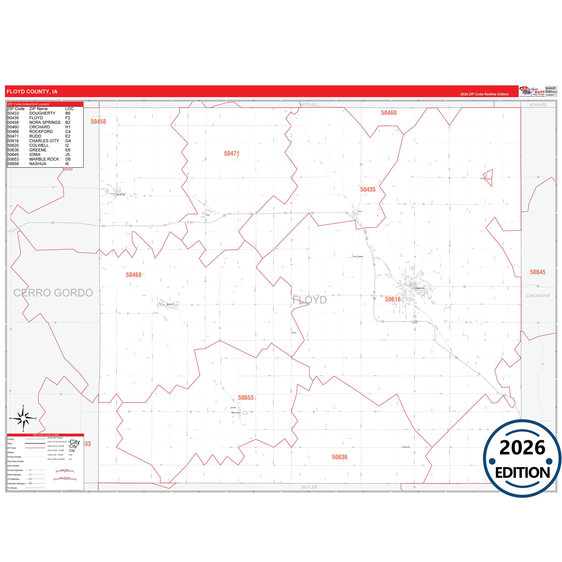 The RedLine Style map of Floyd County, IA shows ZIP code areas overlaid on a detailed road network of Floyd County, Iowa. Ideal for drawing locations, territories, and other applications. Base map features include all major streets and highways labeled, cities and towns, county and state boundaries, neighborhood names, railroads, and a clean white background suitable for marking and planning.