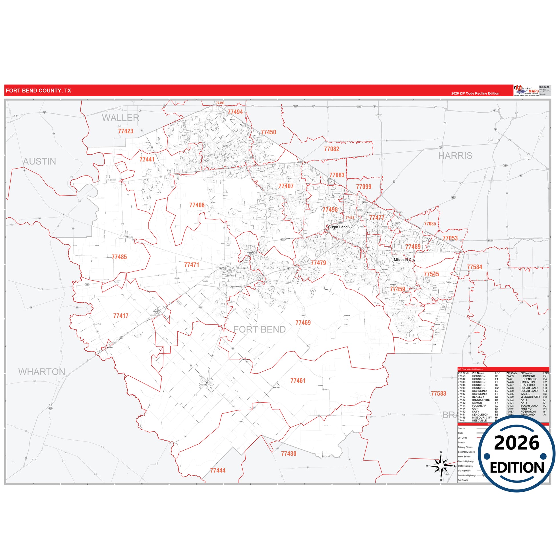 The RedLine Style map of Fort Bend County, TX shows ZIP code areas overlaid on a detailed road network of Fort Bend County, Texas. Ideal for drawing locations, territories, and other applications. Base map features include all major streets and highways labeled, cities and towns, county and state boundaries, neighborhood names, railroads, and a clean white background suitable for marking and planning.