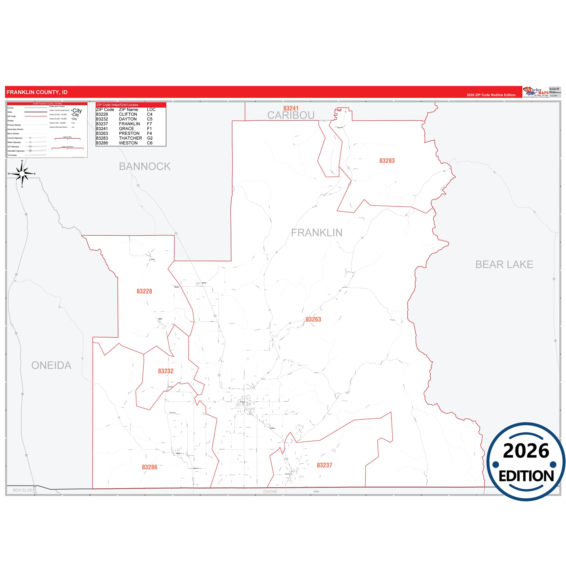 The RedLine Style map of Franklin County, ID shows ZIP code areas overlaid on a detailed road network of Franklin County, Idaho. Ideal for drawing locations, territories, and other applications. Base map features include all major streets and highways labeled, cities and towns, county and state boundaries, neighborhood names, railroads, and a clean white background suitable for marking and planning.