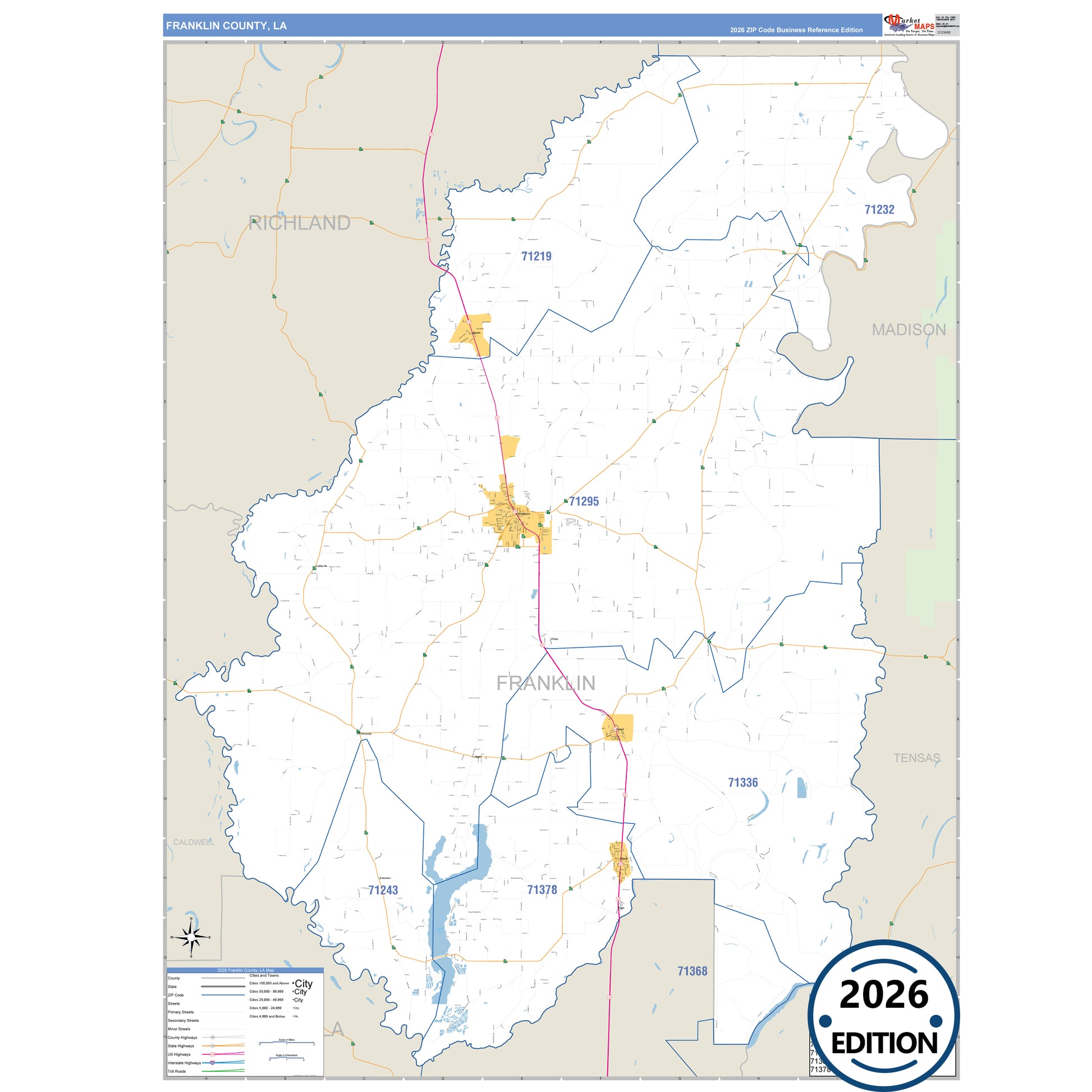 The Business Reference Style Franklin County, LA is a detailed map that includes all towns, cities, major roadways, and highways. Available in multiple wall map sizes, perfect for home, school, office, or business display.