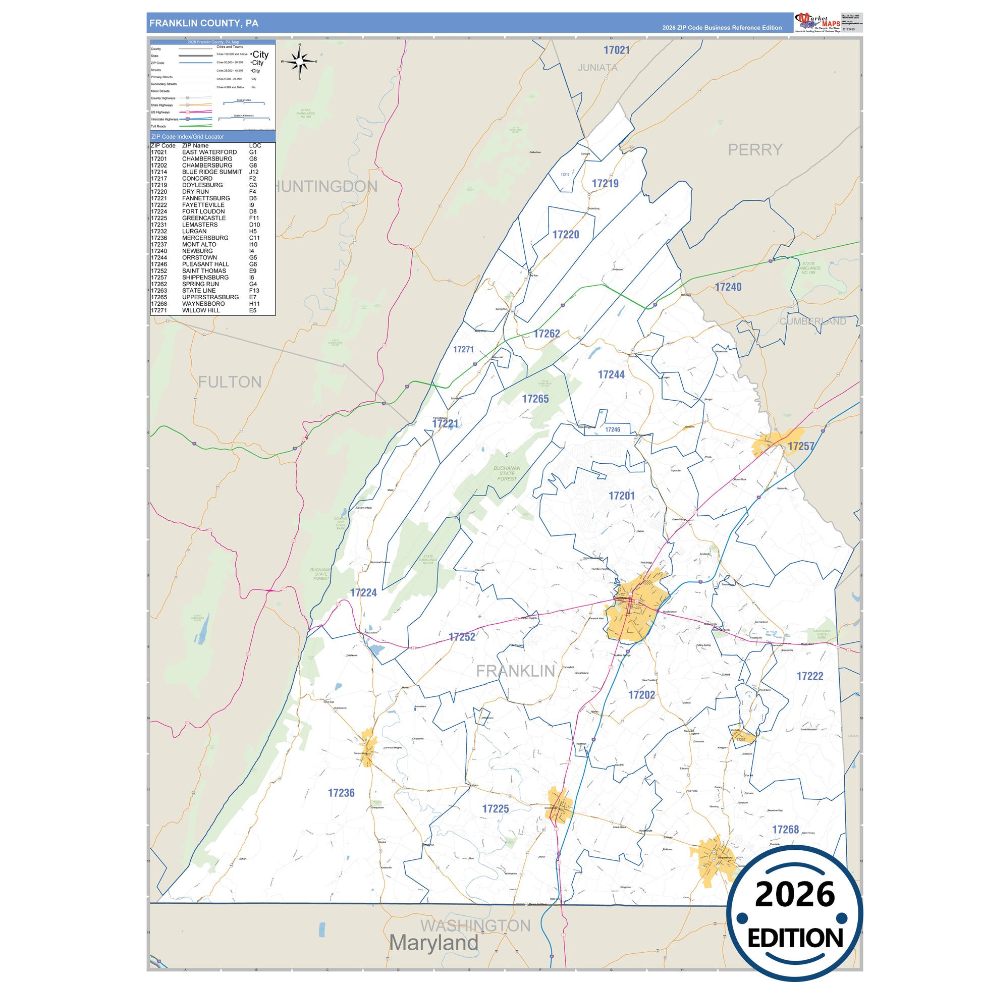 The Business Reference Style Franklin County, PA is a detailed map that includes all towns, cities, major roadways, and highways. Available in multiple wall map sizes, perfect for home, school, office, or business display.