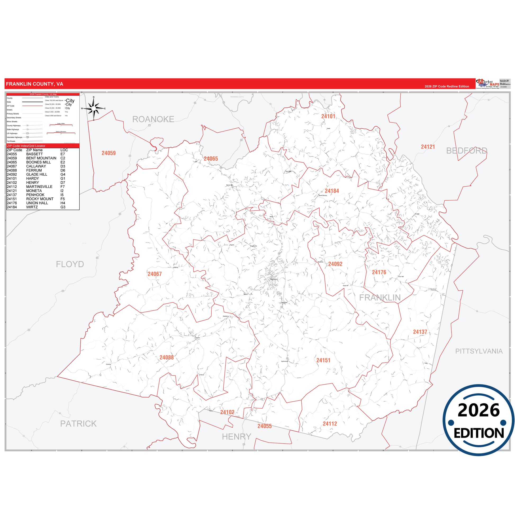 The RedLine Style map of Franklin County, VA shows ZIP code areas overlaid on a detailed road network of Franklin County, Virginia. Ideal for drawing locations, territories, and other applications. Base map features include all major streets and highways labeled, cities and towns, county and state boundaries, neighborhood names, railroads, and a clean white background suitable for marking and planning.