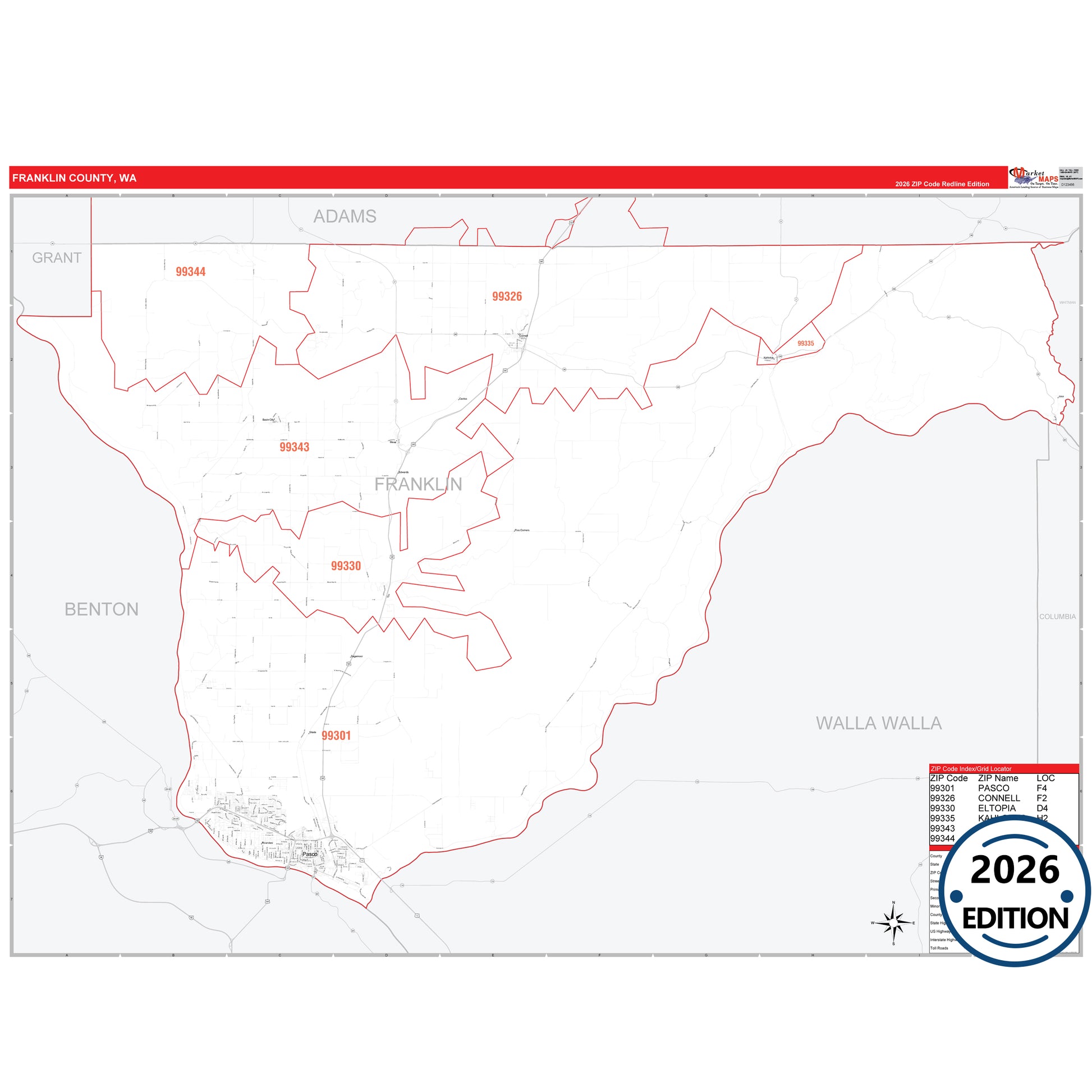 The RedLine Style map of Franklin County, WA shows ZIP code areas overlaid on a detailed road network of Franklin County, Washington. Ideal for drawing locations, territories, and other applications. Base map features include all major streets and highways labeled, cities and towns, county and state boundaries, neighborhood names, railroads, and a clean white background suitable for marking and planning.