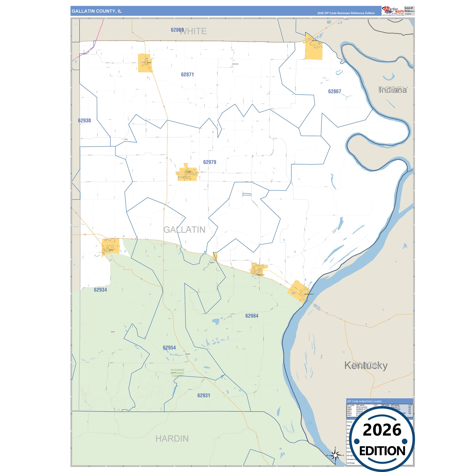 The Business Reference Style Gallatin County, IL is a detailed map that includes all towns, cities, major roadways, and highways. Available in multiple wall map sizes, perfect for home, school, office, or business display.