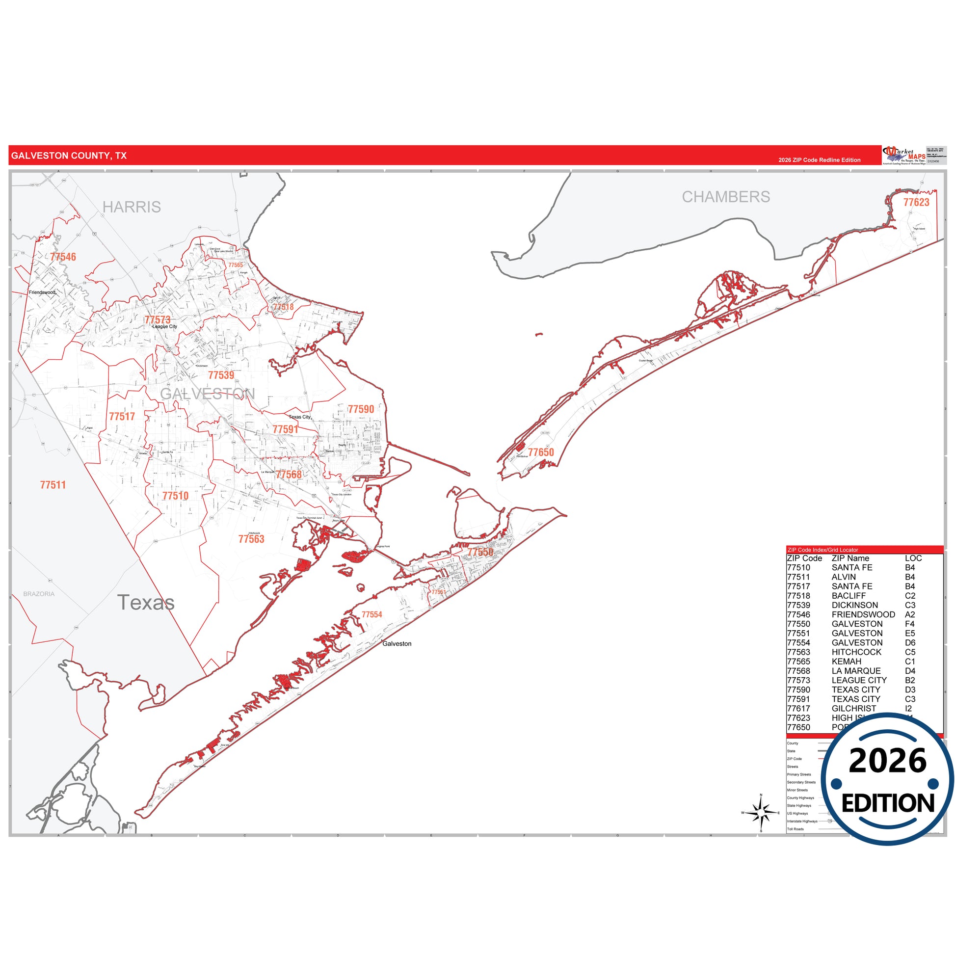 The RedLine Style map of Galveston County, TX shows ZIP code areas overlaid on a detailed road network of Galveston County, Texas. Ideal for drawing locations, territories, and other applications. Base map features include all major streets and highways labeled, cities and towns, county and state boundaries, neighborhood names, railroads, and a clean white background suitable for marking and planning.
