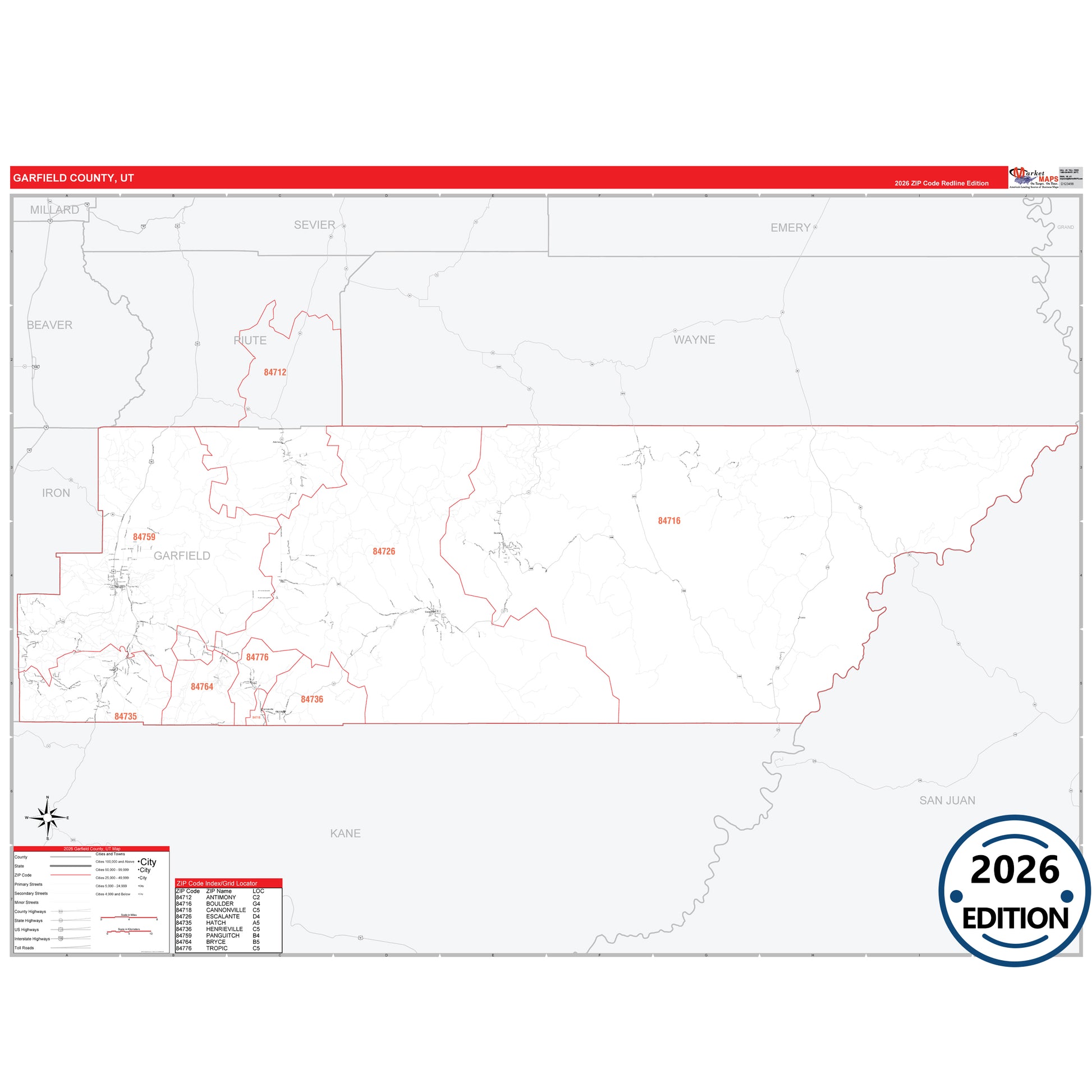 The RedLine Style map of Garfield County, UT shows ZIP code areas overlaid on a detailed road network of Garfield County, Utah. Ideal for drawing locations, territories, and other applications. Base map features include all major streets and highways labeled, cities and towns, county and state boundaries, neighborhood names, railroads, and a clean white background suitable for marking and planning.