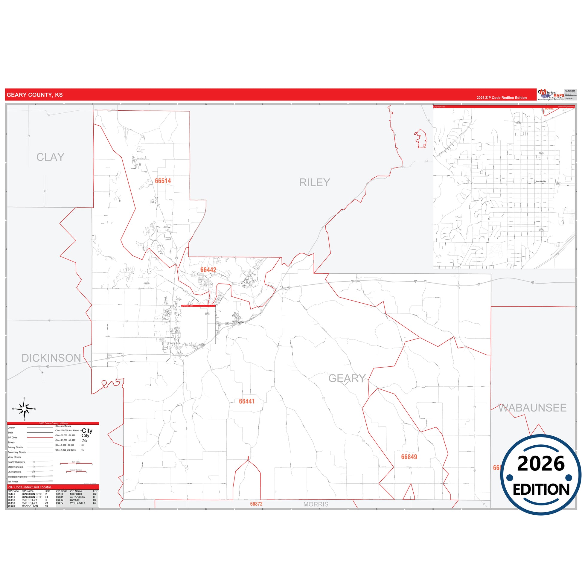The RedLine Style map of Geary County, KS shows ZIP code areas overlaid on a detailed road network of Geary County, Kansas. Ideal for drawing locations, territories, and other applications. Base map features include all major streets and highways labeled, cities and towns, county and state boundaries, neighborhood names, railroads, and a clean white background suitable for marking and planning.