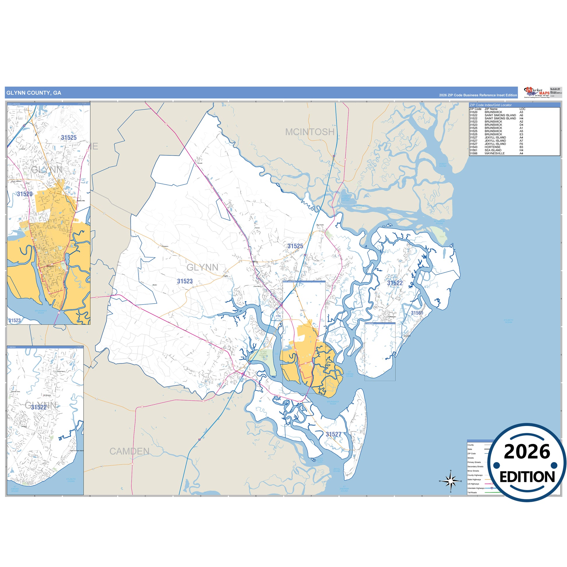 The Business Reference Style Glynn County, GA is a detailed map that includes all towns, cities, major roadways, and highways. Available in multiple wall map sizes, perfect for home, school, office, or business display.