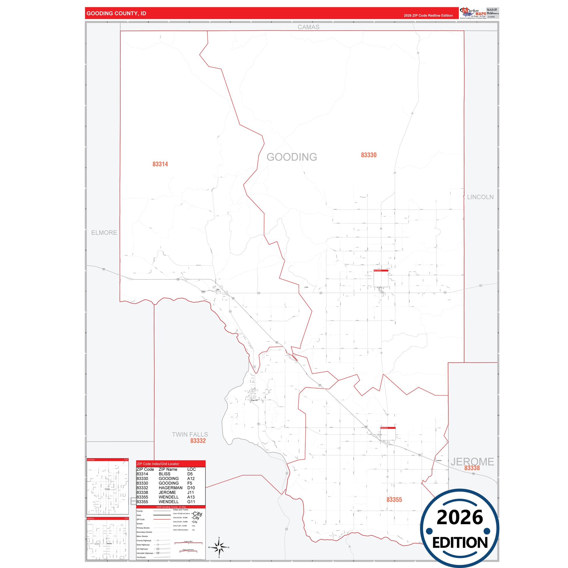 The RedLine Style map of Gooding County, ID shows ZIP code areas overlaid on a detailed road network of Gooding County, Idaho. Ideal for drawing locations, territories, and other applications. Base map features include all major streets and highways labeled, cities and towns, county and state boundaries, neighborhood names, railroads, and a clean white background suitable for marking and planning.