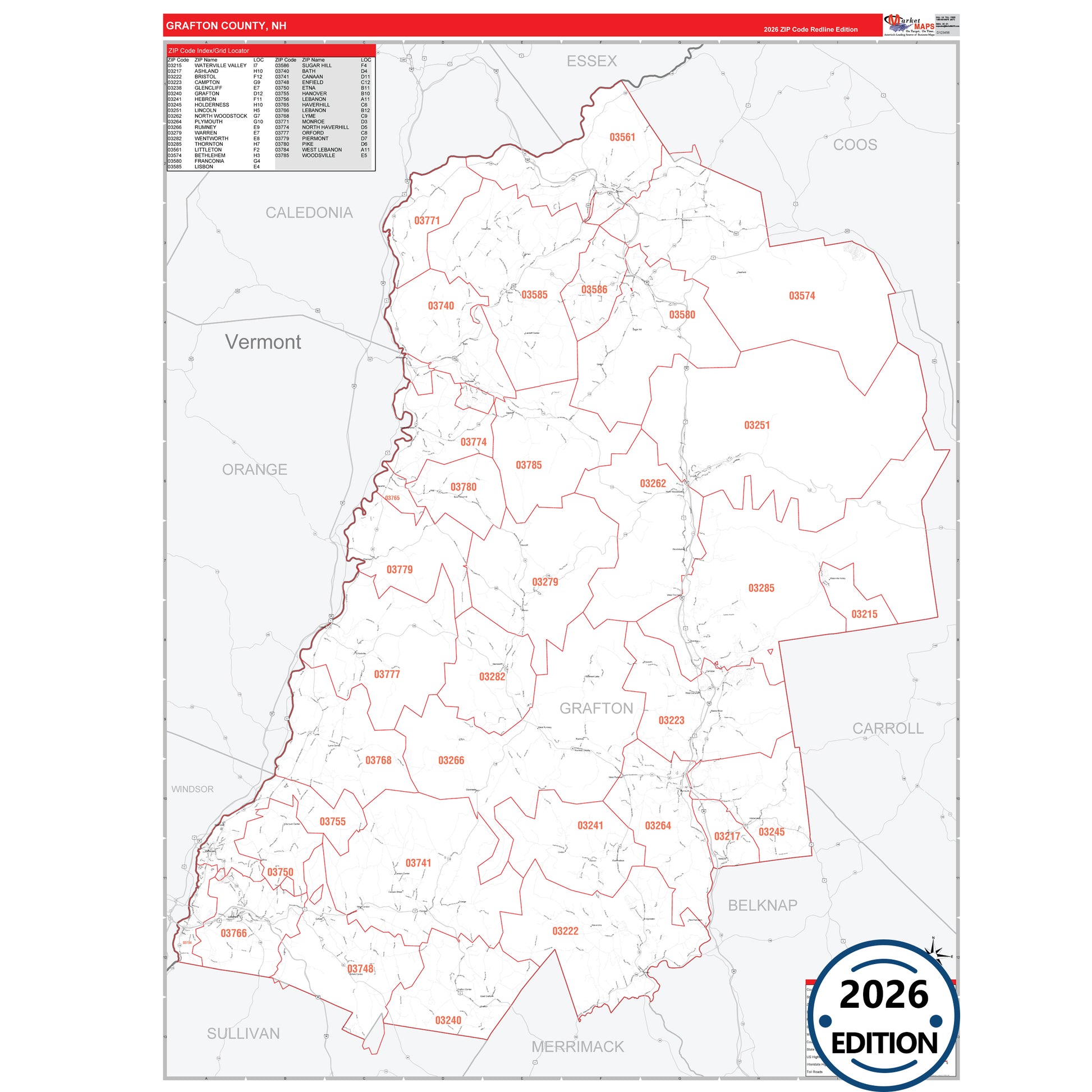 The RedLine Style map of Grafton County, NH shows ZIP code areas overlaid on a detailed road network of Grafton County, New Hampshire. Ideal for drawing locations, territories, and other applications. Base map features include all major streets and highways labeled, cities and towns, county and state boundaries, neighborhood names, railroads, and a clean white background suitable for marking and planning.