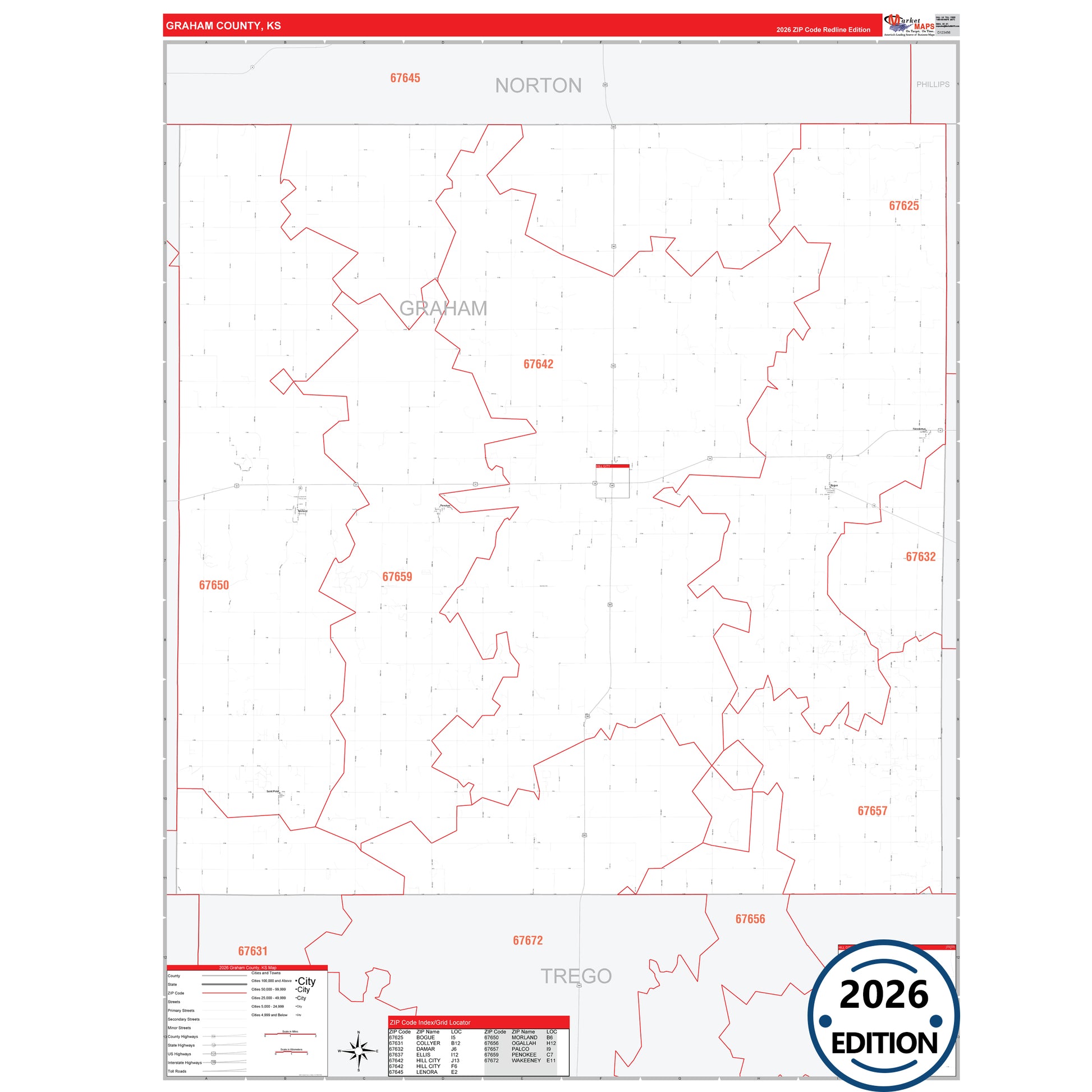 The RedLine Style map of Graham County, KS shows ZIP code areas overlaid on a detailed road network of Graham County, Kansas. Ideal for drawing locations, territories, and other applications. Base map features include all major streets and highways labeled, cities and towns, county and state boundaries, neighborhood names, railroads, and a clean white background suitable for marking and planning.