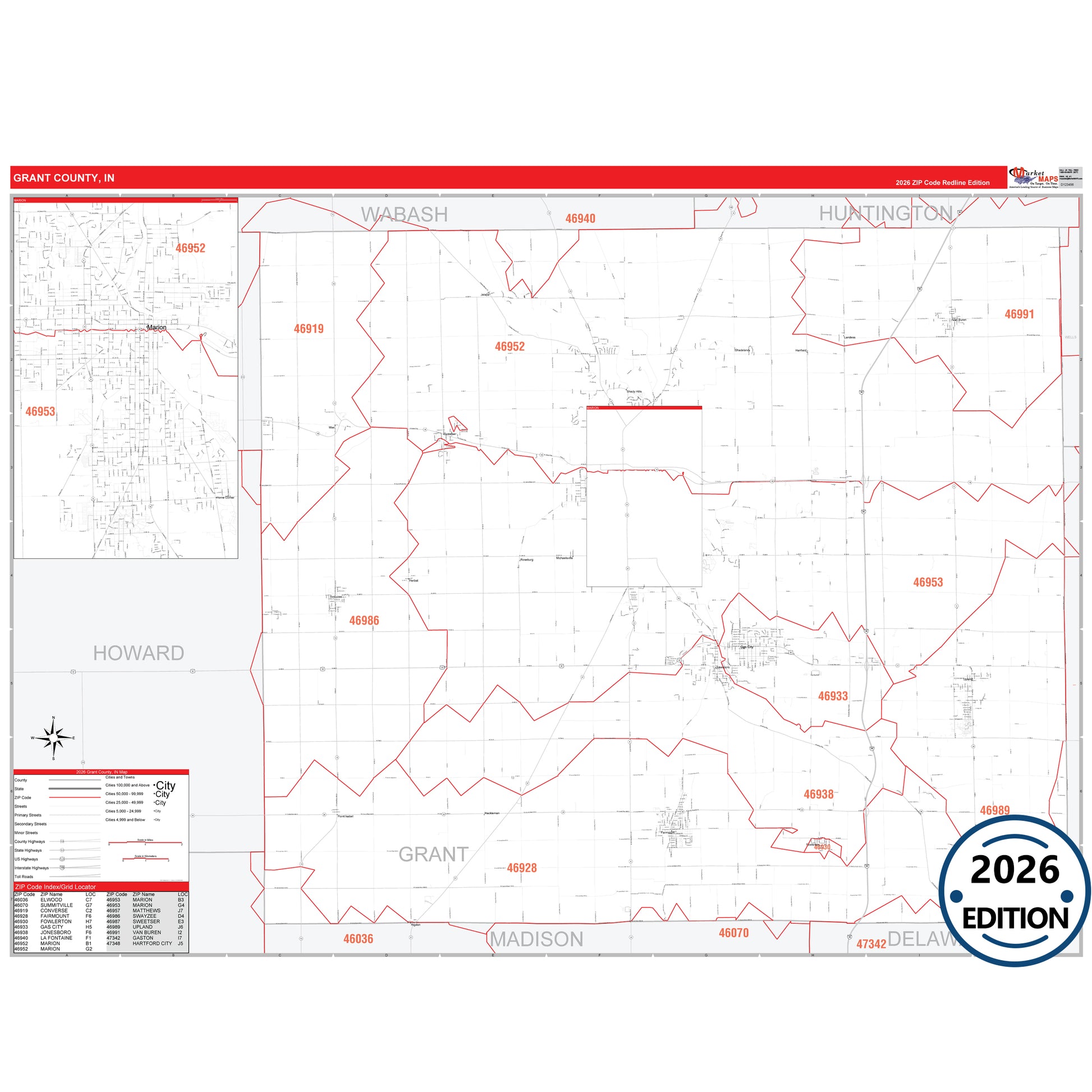The RedLine Style map of Grant County, IN shows ZIP code areas overlaid on a detailed road network of Grant County, Indiana. Ideal for drawing locations, territories, and other applications. Base map features include all major streets and highways labeled, cities and towns, county and state boundaries, neighborhood names, railroads, and a clean white background suitable for marking and planning.