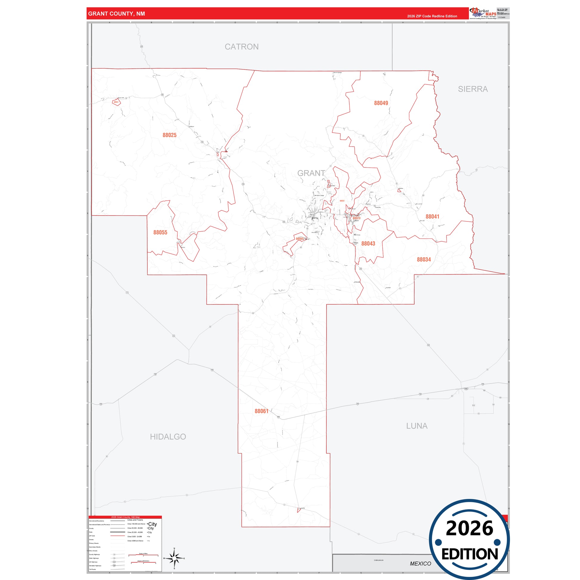 The RedLine Style map of Grant County, NM shows ZIP code areas overlaid on a detailed road network of Grant County, New Mexico. Ideal for drawing locations, territories, and other applications. Base map features include all major streets and highways labeled, cities and towns, county and state boundaries, neighborhood names, railroads, and a clean white background suitable for marking and planning.