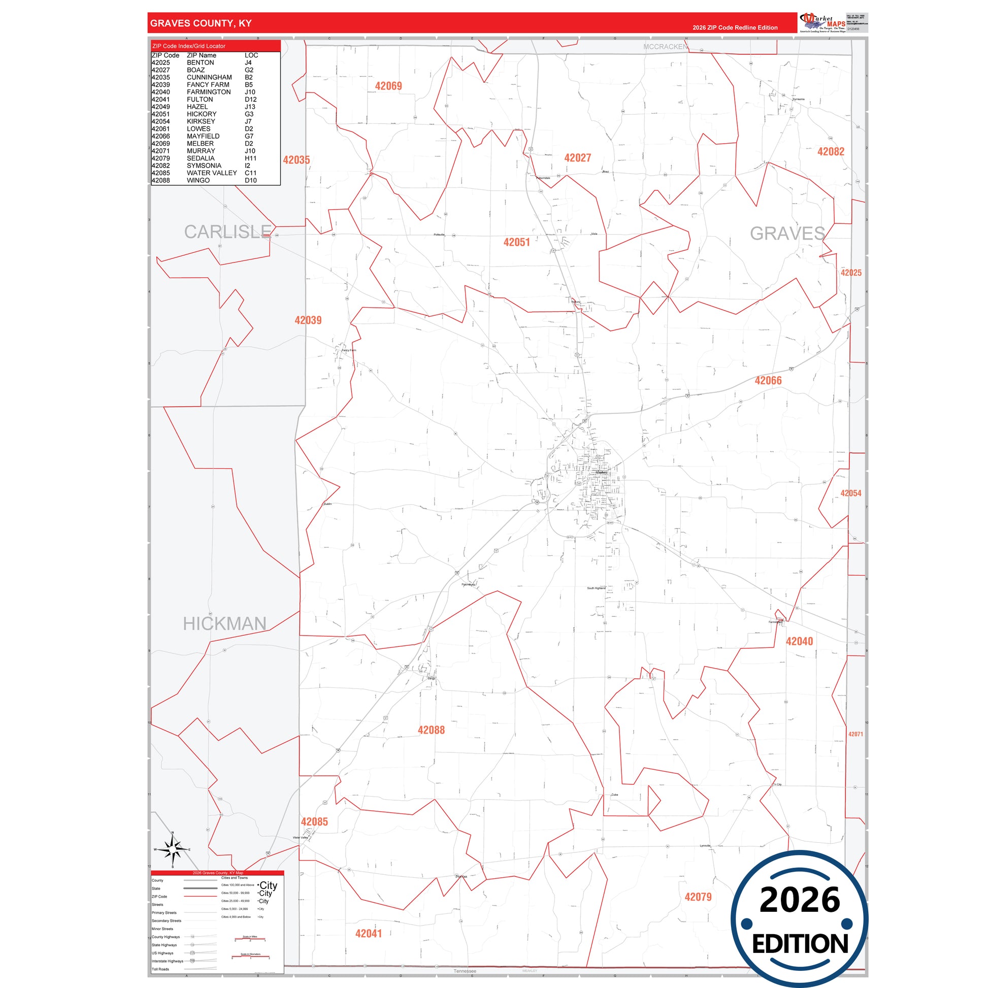 The RedLine Style map of Graves County, KY shows ZIP code areas overlaid on a detailed road network of Graves County, Kentucky. Ideal for drawing locations, territories, and other applications. Base map features include all major streets and highways labeled, cities and towns, county and state boundaries, neighborhood names, railroads, and a clean white background suitable for marking and planning.